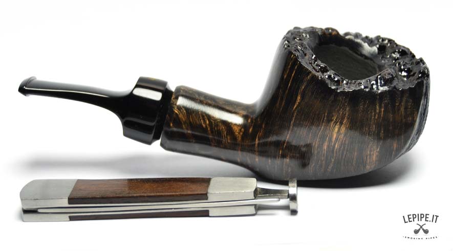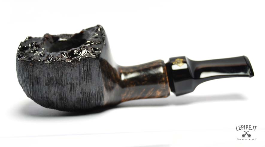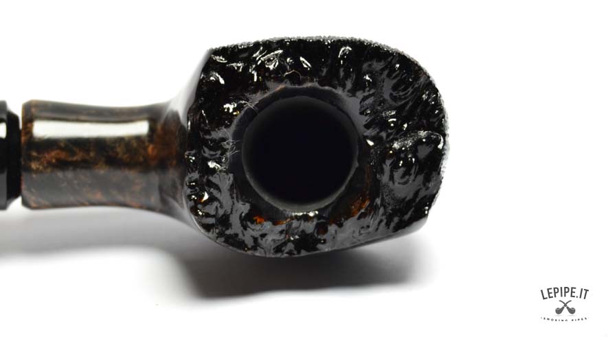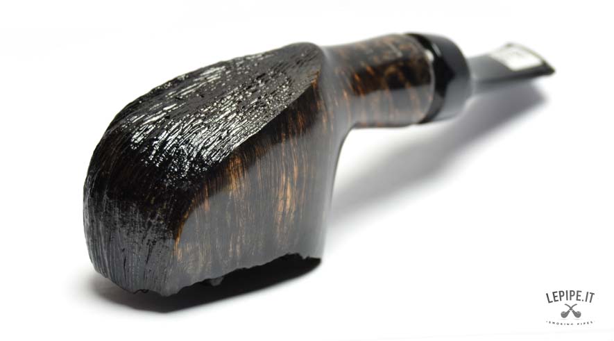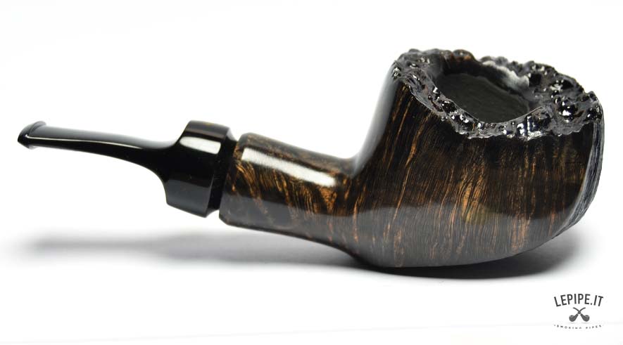 The dark finish, rich and contrasted, enhances the underlying grain, creating a bold visual effect. The rusticated and uneven rim adds a raw, almost primitive character, while the interplay between smooth and textured surfaces gives the pipe depth and dynamism.