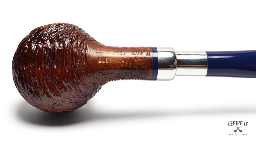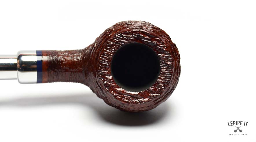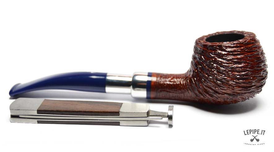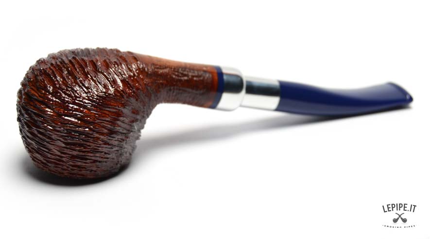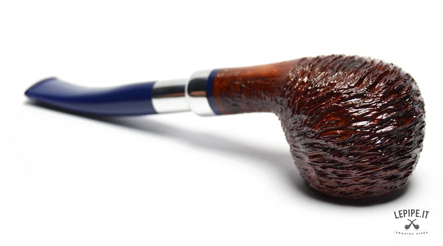 The deep rusticated finish enhances the briar’s natural character with a bold texture that is both tactile and visually appealing. The contrast between the dark bowl and the glossy blue acrylic stem is further enriched by a shiny metal band with blue insert, lending the pipe a contemporary and refined flair.