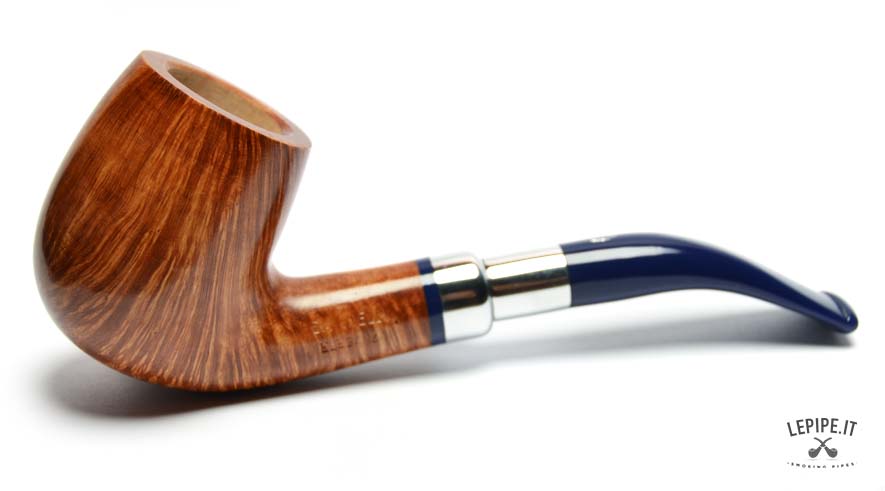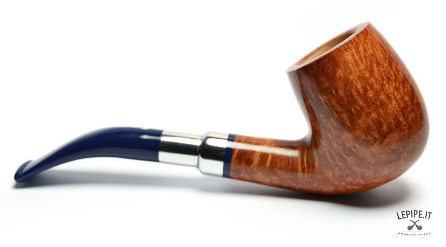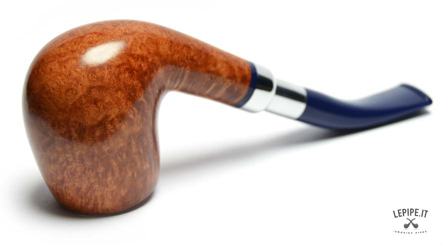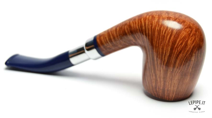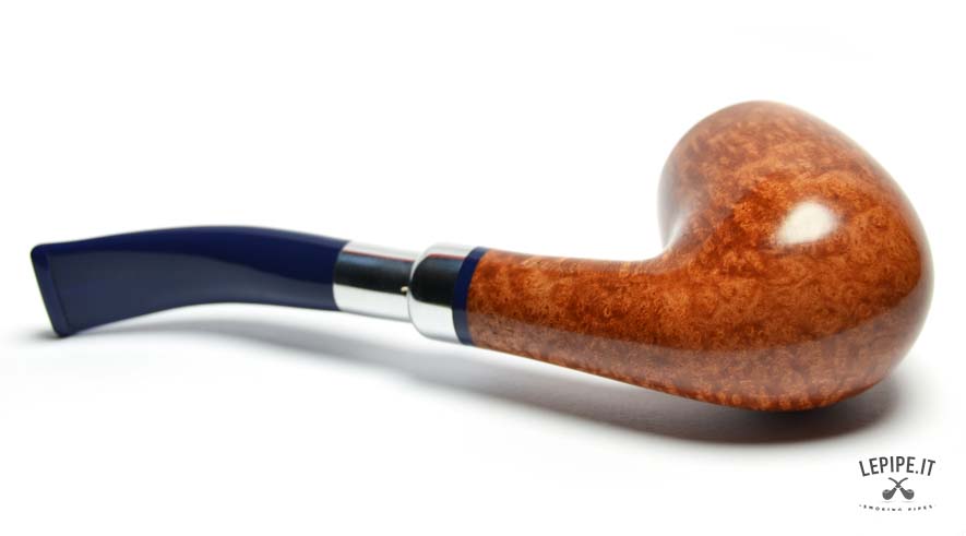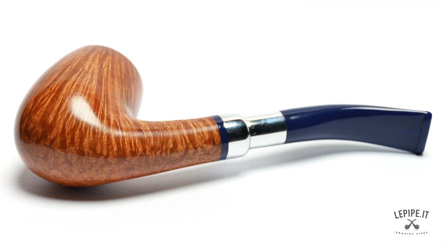 The smooth, high-quality briar reveals beautiful flame grain patterns in warm, bright tones, enhanced by a glossy finish that adds depth and brilliance to the surface. The glossy blue acrylic stem, paired with a metal band and blue accent ring, creates a refined and contemporary contrast.