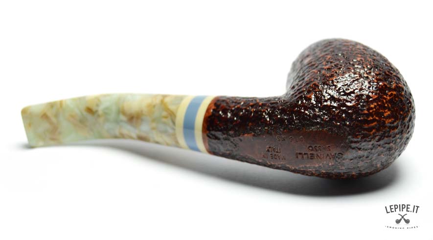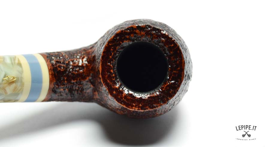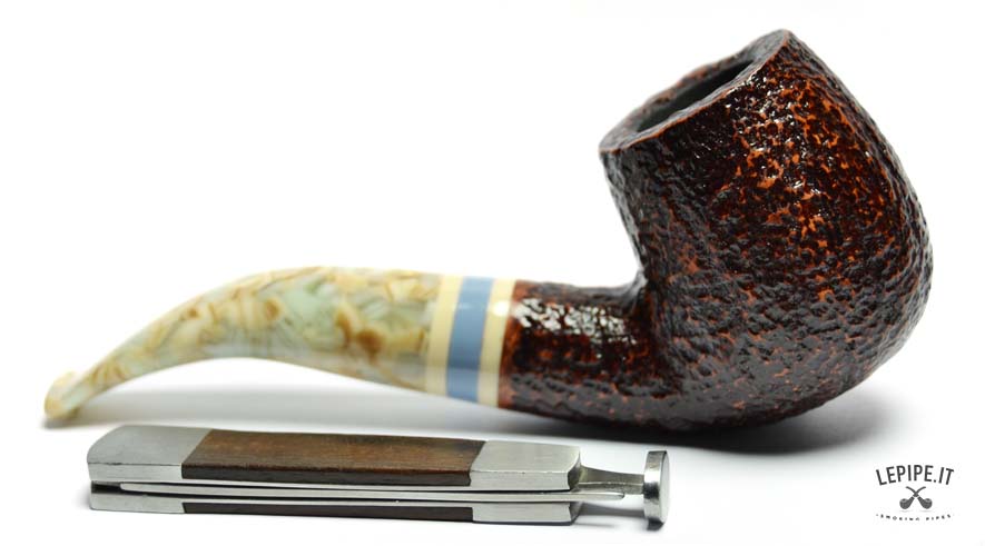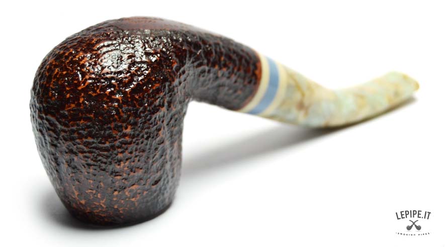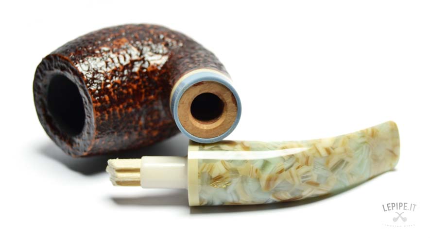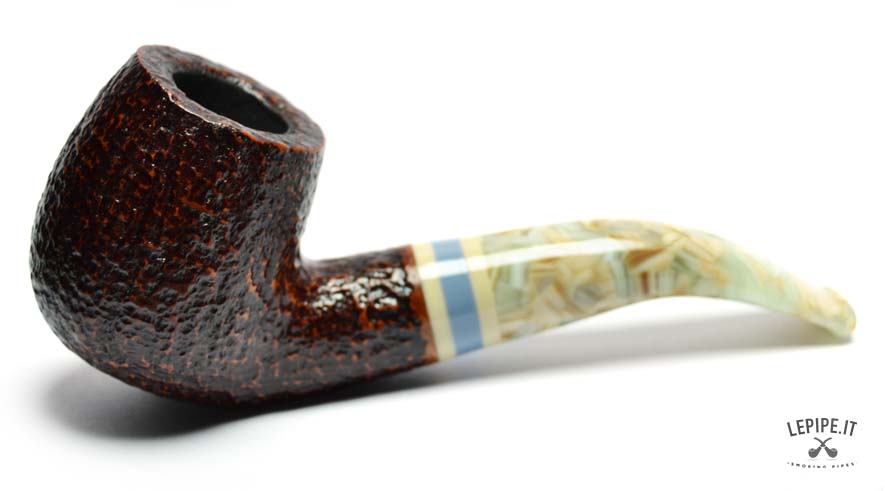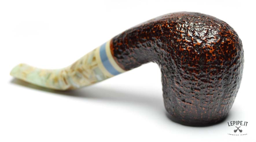 The dark rusticated finish evokes the raw texture of stone, enhancing the briar’s material essence with a striking visual and tactile appeal. The marbled acrylic stem brings a touch of originality and elegance, with soft, veined hues complemented by a refined triple band in ivory, blue, and beige.