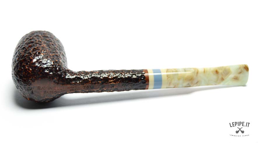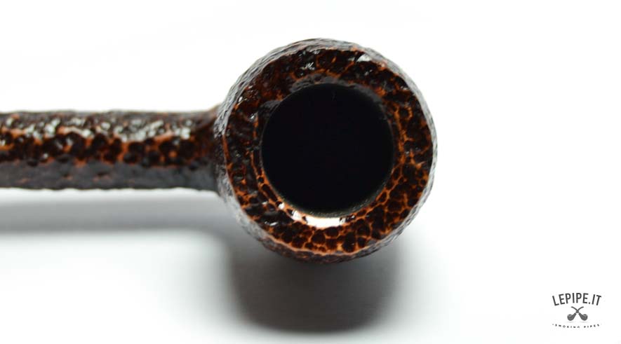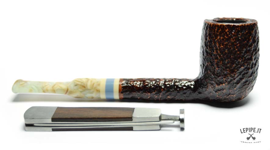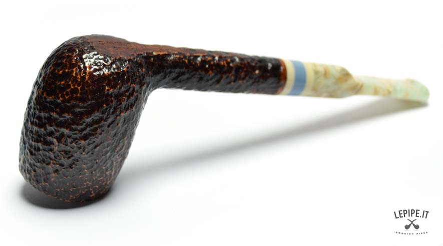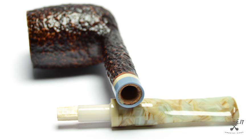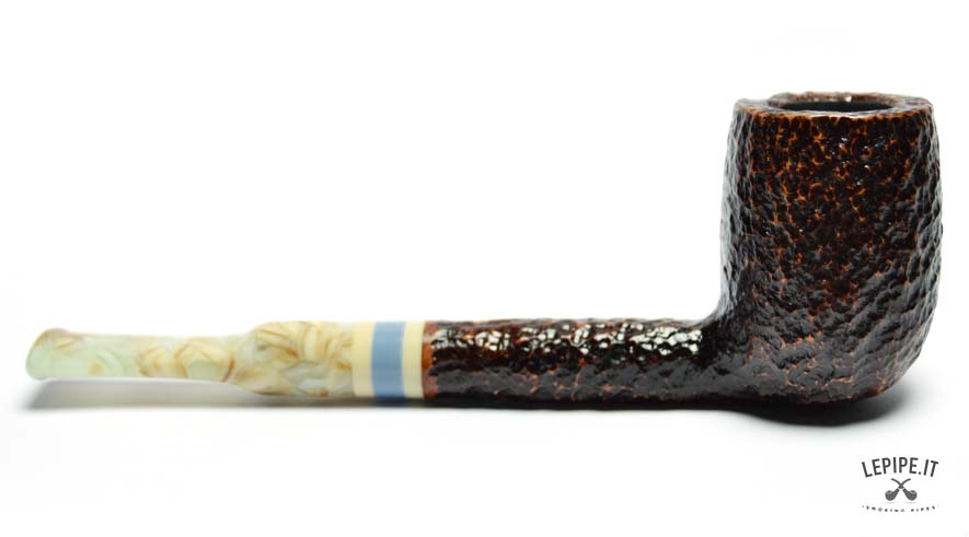 The rusticated finish, inspired by the texture of stone, gives the briar a raw, natural look with deep, earthy tones. The marbled acrylic stem offers a fascinating visual contrast, with its light swirls and irregular patterns, elegantly highlighted by a triple band in ivory, blue, and beige at the junction.