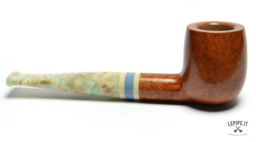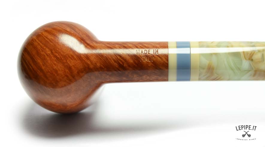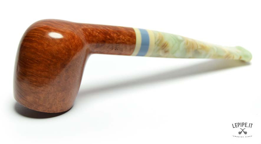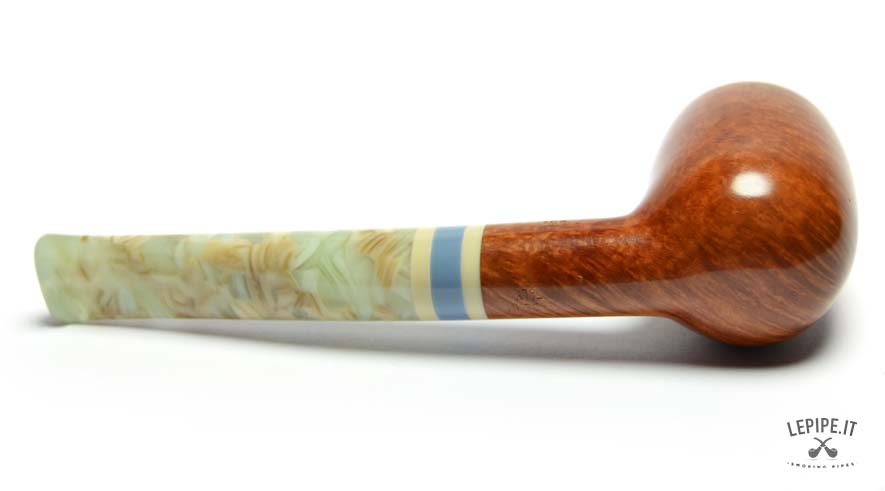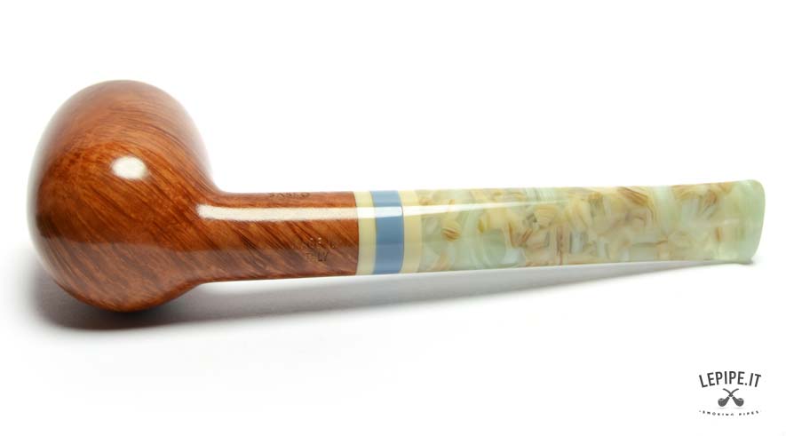 The smooth finish enhances the quality of the briar, revealing warm, soft grain patterns brought to life by a glossy polish. The marbled acrylic stem, with pale swirls and light translucence, is perfectly matched with the series' signature triple band in ivory, blue, and beige.