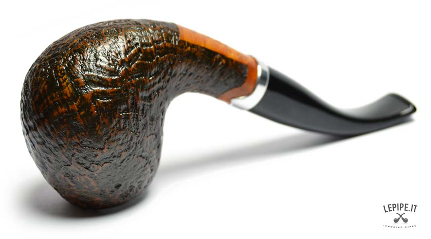 A distinctive aesthetic element is the smooth, polished section left visible on the shank, interrupting the sandblasting with a flowing wave of lighter wood. The bent black acrylic stem is fitted for 9 mm filters and connects to the bowl with a polished metal band that reinforces the structure and adds a refined visual accent.