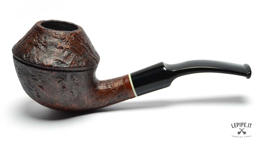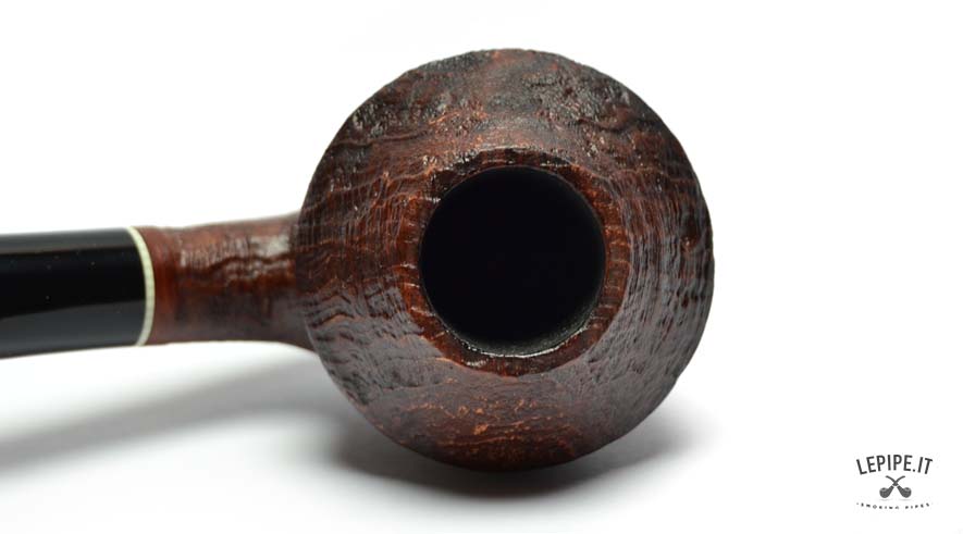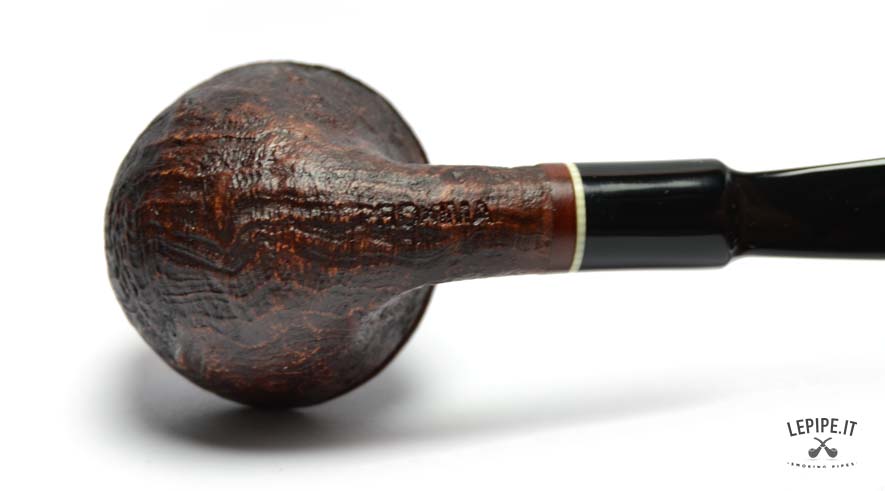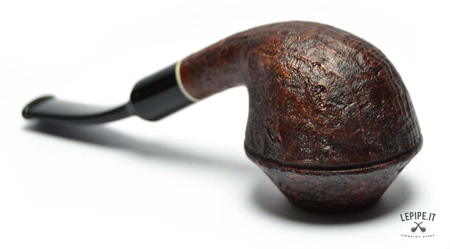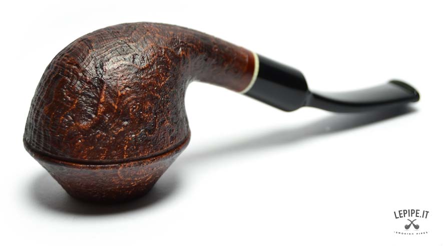 This Rhodesian shape pipe features the distinctive flattened bowl with a double-bead line that enhances its harmonious form. The dark sandblasted finish highlights the briar’s grain and natural texture, giving it a refined yet authentic appearance.