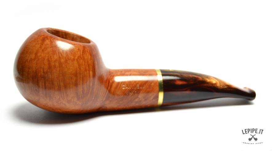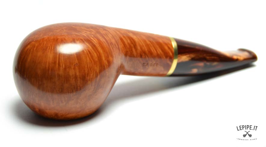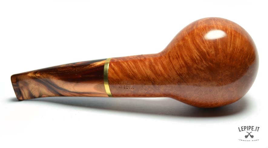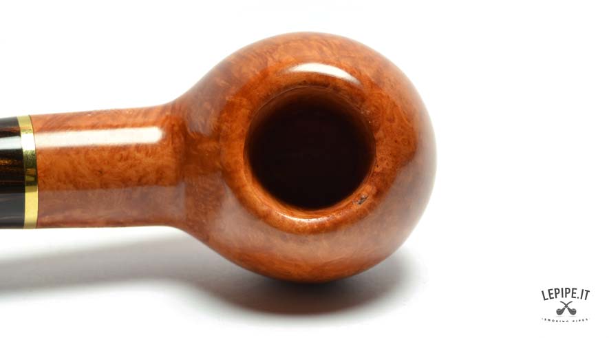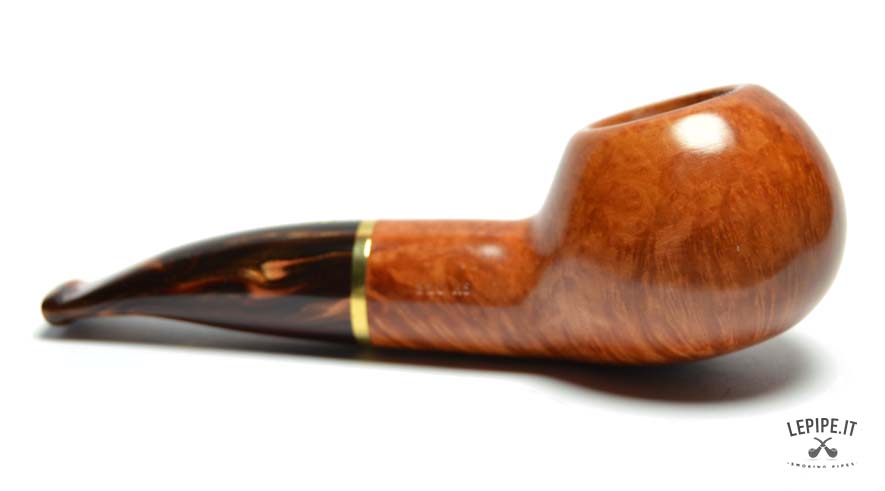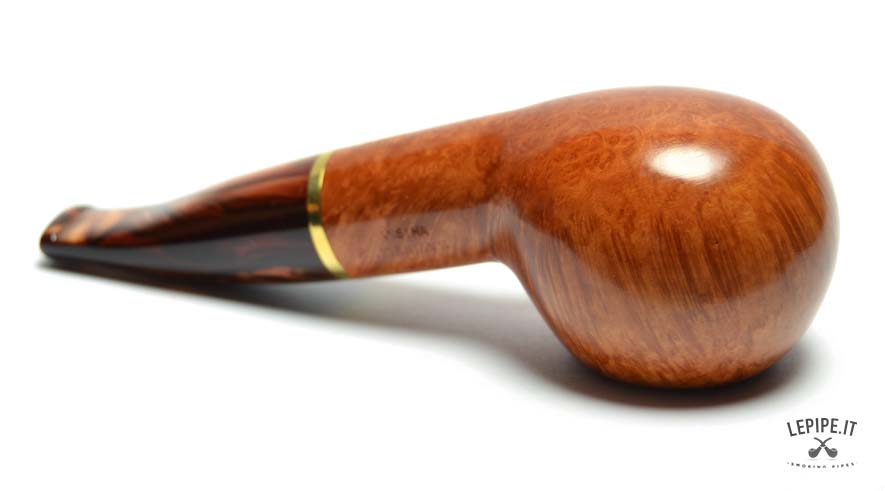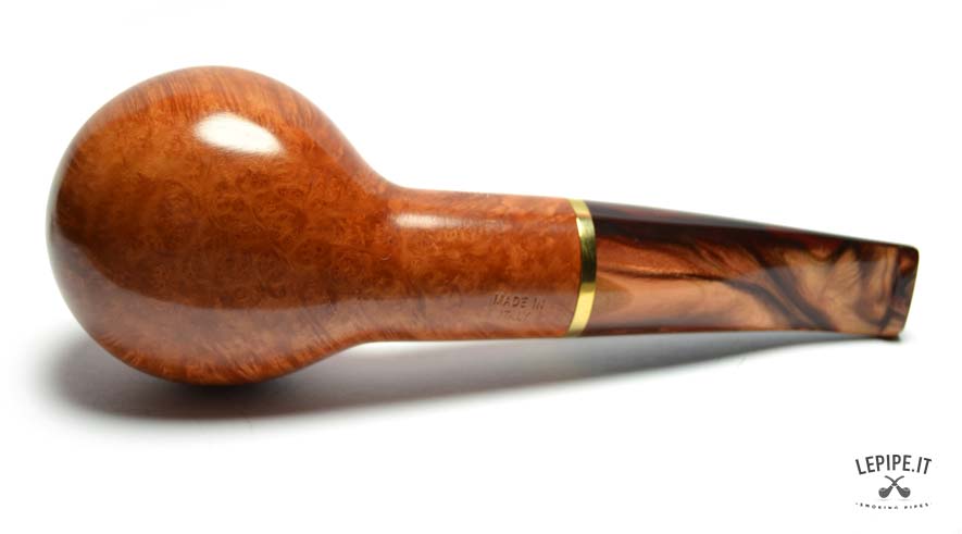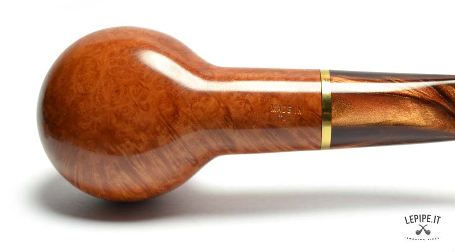 Made from premium Italian briar, it displays a warm, polished finish that highlights the natural grain with remarkable depth and character. The pipe is fitted with a marbled acrylic stem in rich, warm tones, accented by a gold-colored band that adds a refined visual touch.