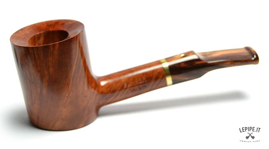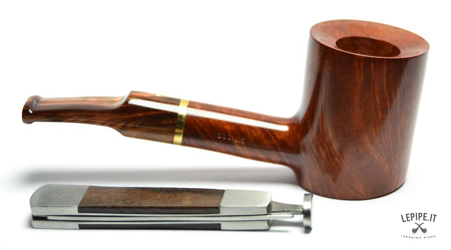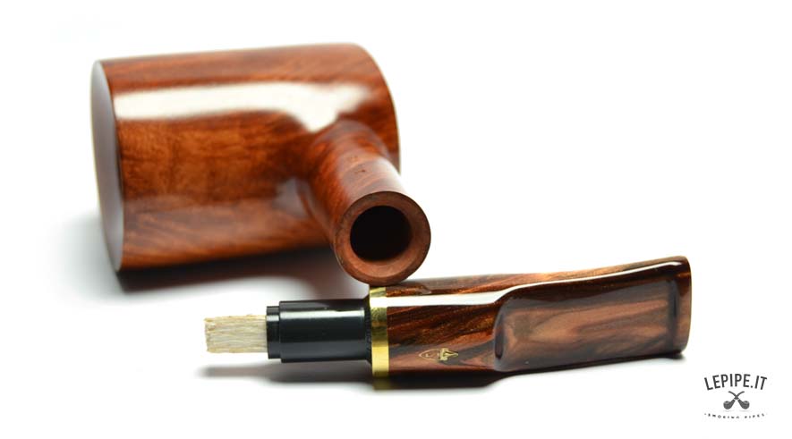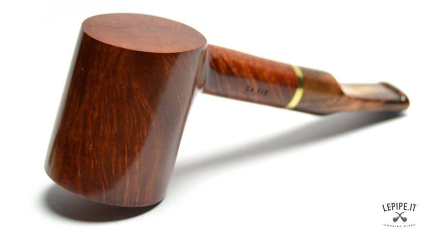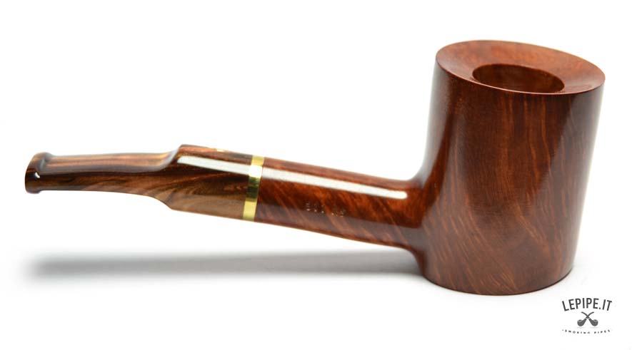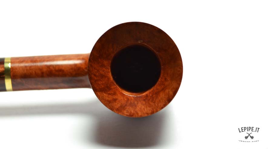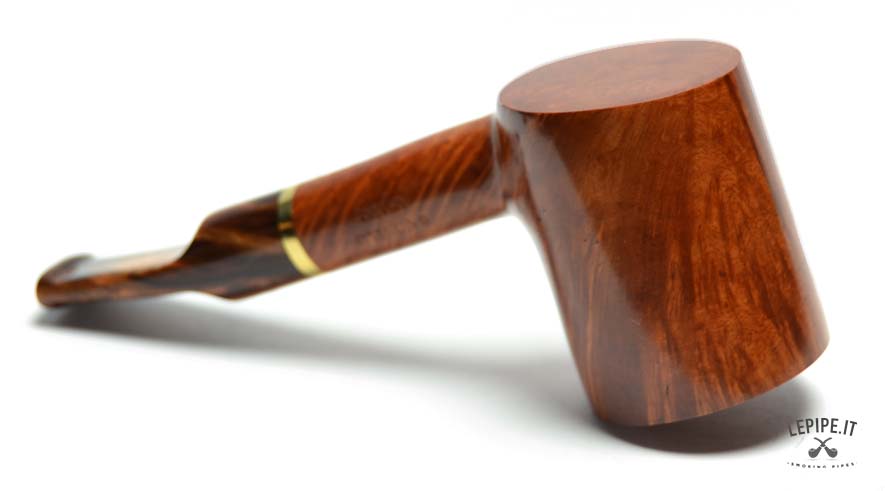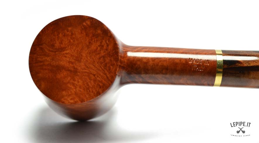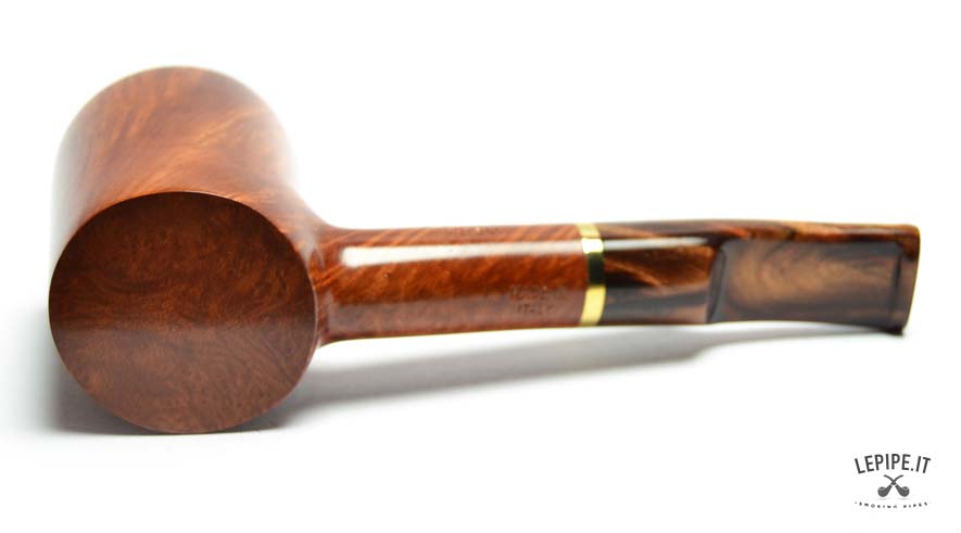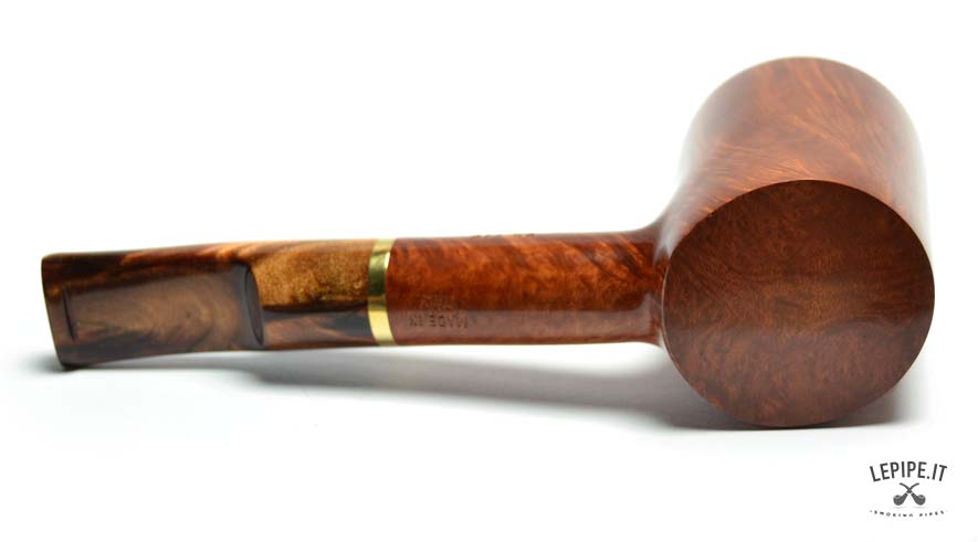 Crafted from high-quality Italian briar, it boasts a smooth, polished finish that enhances the natural grain of the wood, offering a warm and refined aesthetic. The marbled acrylic stem in warm tones is elegantly accented with a gold-colored band, adding both balance and a touch of sophistication.