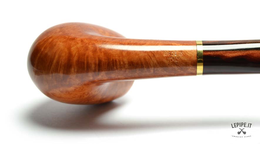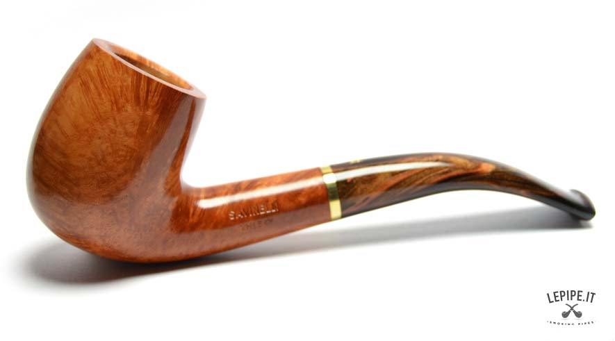 Crafted from high-grade Italian briar, the pipe features a smooth, polished finish in rich honey and amber tones, accentuating the natural grain with warmth and depth. The marbled acrylic stem, with swirling shades reminiscent of fine whisky, complements the bowl beautifully and is connected by a lustrous gold-colored band—a subtle nod to Savinelli’s artisanal excellence.