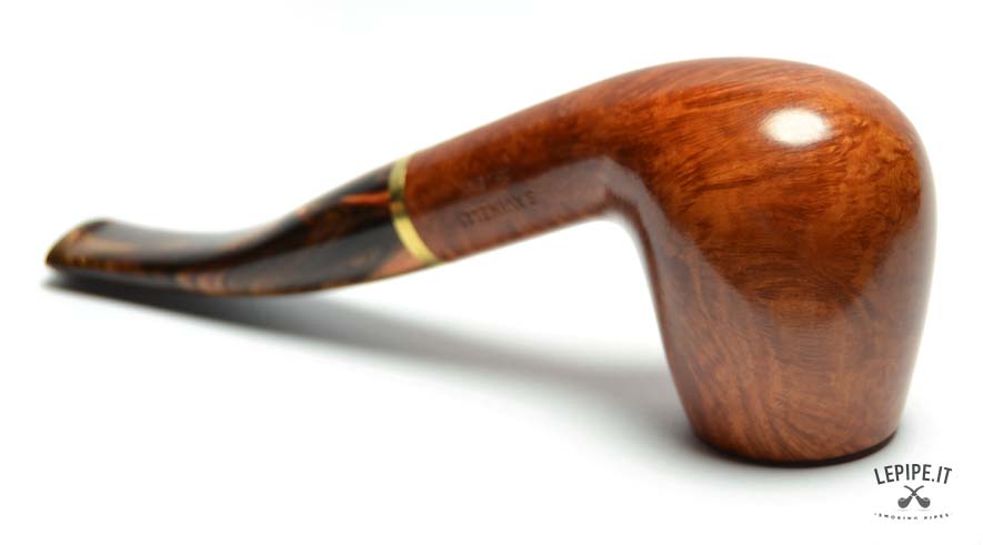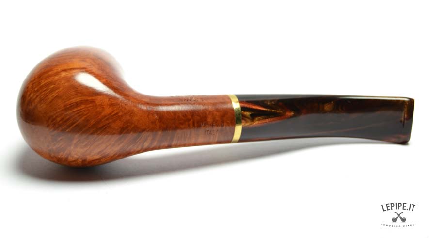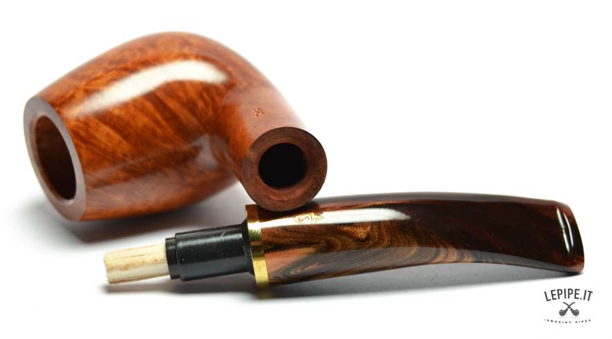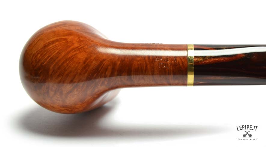 Crafted from premium Italian briar wood, the pipe features a smooth, warm honey-brown finish that beautifully highlights the natural grain of the wood. The marbled acrylic stem, with deep brown and golden hues, flows seamlessly from the bowl and is accented by a polished gold-colored band—a subtle yet striking detail that reflects Savinelli’s dedication to artisanal quality.
