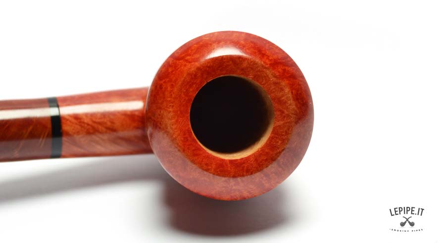 The acrylic stem, expertly shaped, stands out for its refined contrasting decorative motif, featuring circular inlays that echo the warm tones of the briar and create a perfect visual balance.