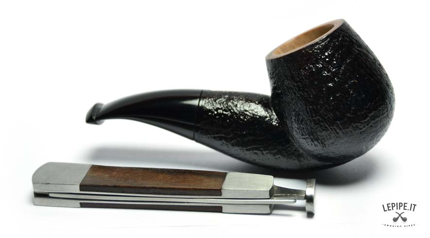 This Bent Billiard pipe is a refined creation by Manù, the brand of Italian artisan Emanuele Bruno, who brings modern sculptural sensibility to traditional forms. The classic curved Billiard shape is expressed here with balance and grace, resulting in a harmonious and well-proportioned silhouette. The pipe features a deep black sandblasted finish that enhances the texture of the briar, offering strong visual contrast with the natural bowl interior and lending the piece an elegant yet bold character. The gentle bend ensures a comfortable grip and excellent smoking ergonomics. The glossy ebonite mouthpiece, slightly curved, completes the profile with refined continuity, offering comfort and a smooth feel on the teeth. Weighing 40 grams, this pipe delivers a substantial yet manageable smoke, suitable for both relaxed sessions and daily use. An outstanding example of a handmade Italian pipe that blends classic form, careful finishing, and high-quality materials.