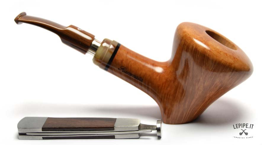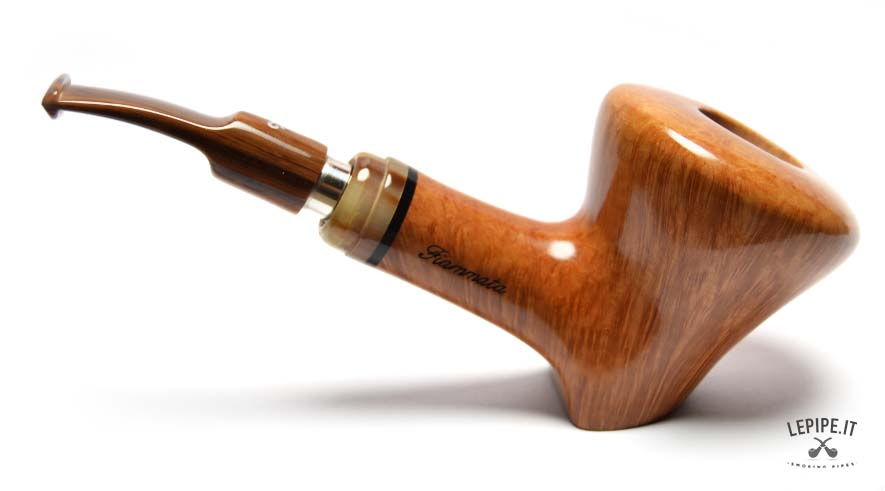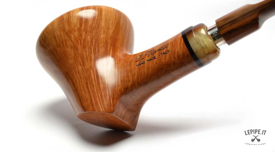 Bold lines and natural elegance come together in this Freeform pipe by L. Viprati, a fully handmade piece crafted in Italy. The distinctive stand-up design allows the pipe to rest upright on a flat surface, highlighting the sculptural quality of the flame-grain briar. Its glossy finish brings out the richness and direction of the grain, with warm, vibrant reflections. The horn-effect acrylic stem, adorned with a stylish decorative ring and equipped with a 9 mm filter chamber and reducer, ensures a smooth, customizable smoking experience. A perfect blend of form and function, this pipe is made for discerning collectors and enthusiasts alike.