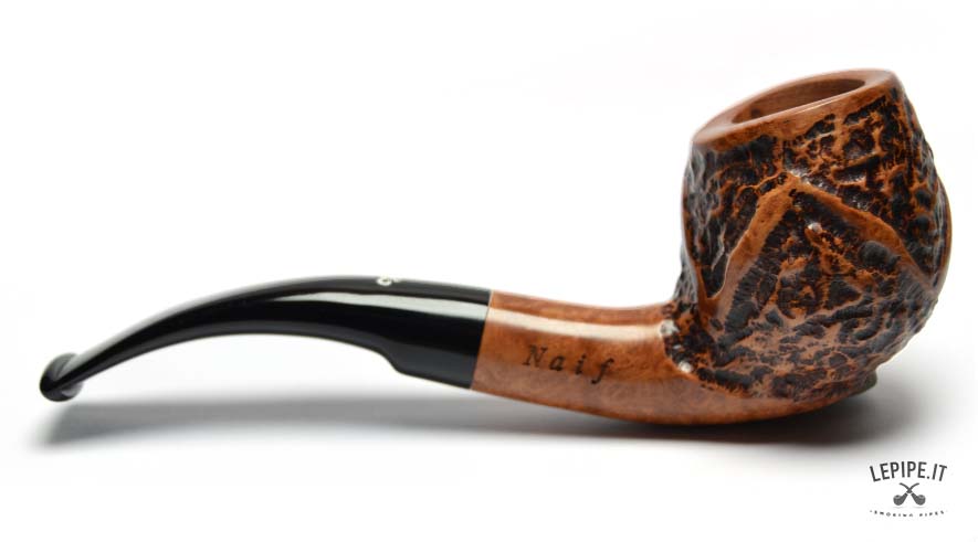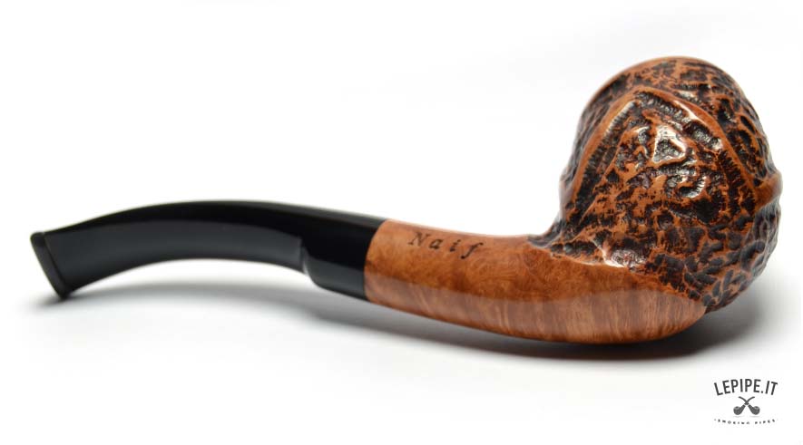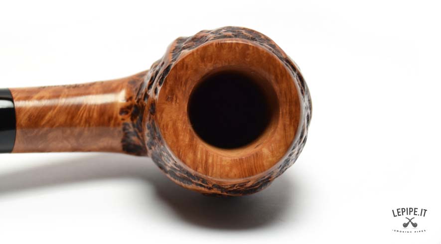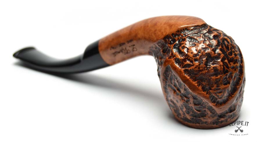 Soft curves and bold personality define this Bent Apple pipe from the Naif series by L. Viprati, entirely handmade in Italy. The generous, rounded bowl features a deep, irregular rustication interrupted by carefully carved smooth sections that highlight the contrast and natural grain of the briar. The deeply bent black acrylic stem ensures a relaxed and comfortable smoking experience, also suitable for hands-free use. Equipped with a 9 mm filter chamber, this pipe offers a personalized approach to smoking pleasure. Every detail reflects the artisan’s artistic and technical mastery, resulting in a piece that perfectly blends functionality with distinctive style.