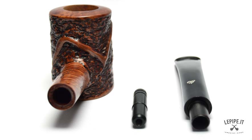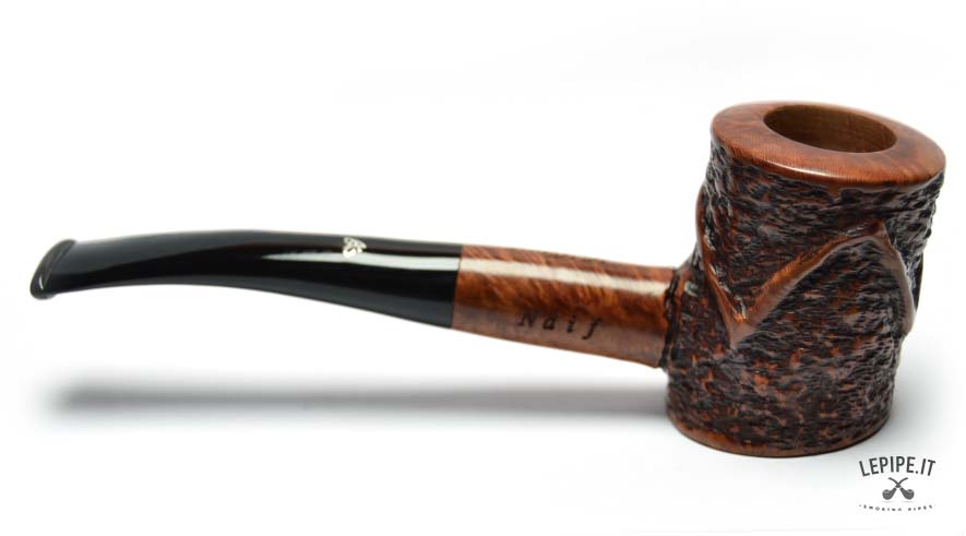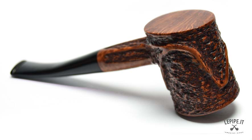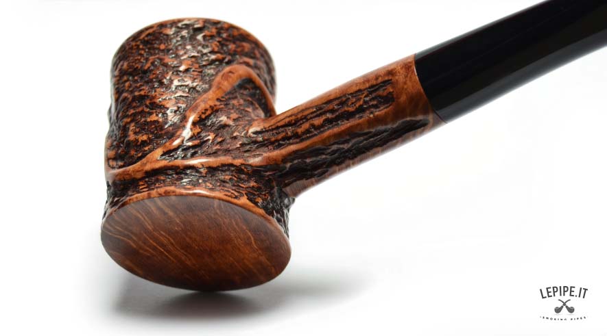 Compact, sturdy, and full of character, this Poker-shaped pipe from the Naif line by L. Viprati is a perfect blend of function and style. The cylindrical, self-standing form pairs beautifully with a deep, hand-carved rustication that follows angular, geometric lines, giving the briar a bold and modern look. The generous bowl and flat base make it ideal for relaxed moments, as it can be rested upright without a stand. The gently curved black acrylic stem is fitted with a 9 mm filter chamber, offering versatility for your preferred smoking experience. Weighing only 43 grams, it ensures a comfortable and well-balanced grip, even for hands-free use. A genuine, well-proportioned piece born from the finest Italian craftsmanship.