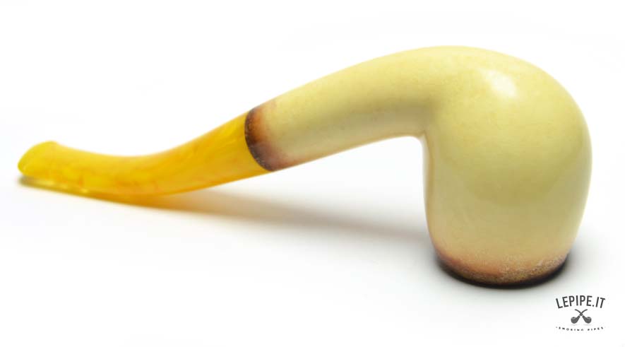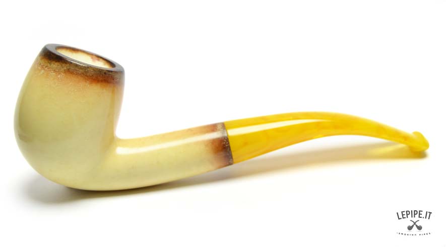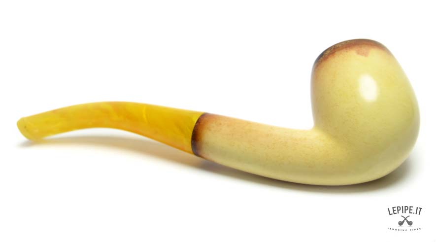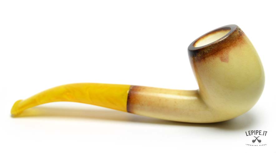 This Bent Billiard meerschaum pipe, weighing just 34 grams, features a beautiful amber-toned finish achieved through a special pre-coloring process that mimics the natural patina meerschaum develops over time. The result is a warm, aged look straight out of the box — though the pipe is brand new and never smoked. Its gently curved shape ensures comfort and balance, while the meerschaum provides a dry, neutral smoke that lets the tobacco's true flavor shine through.