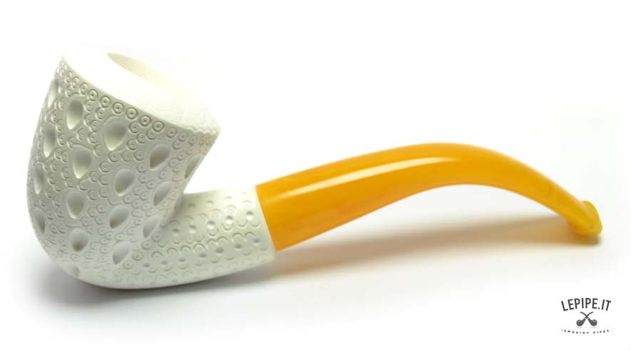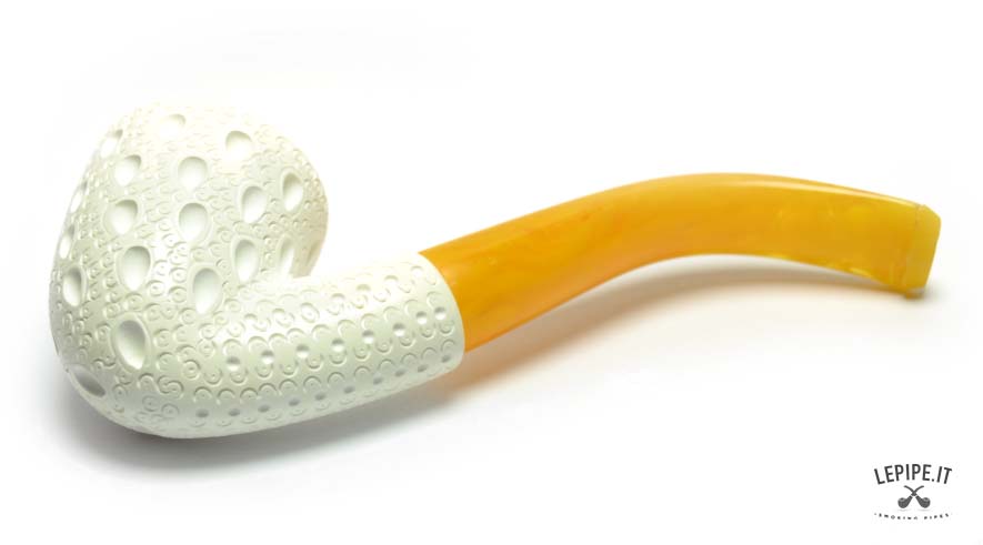 Light and refined, this Bent Dublin pipe weighs just 35 grams and features a beautifully carved, upward-flaring bowl typical of the shape. The meerschaum used here is not only praised for its smoking qualities, but also for its low odor retention: even after frequent use, it doesn’t hold onto aromas, allowing easy tobacco changes. The curved amber acrylic stem adds both style and comfort, rounding out a pipe that’s as practical as it is attractive.