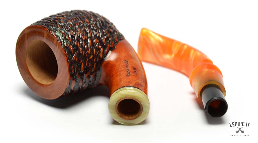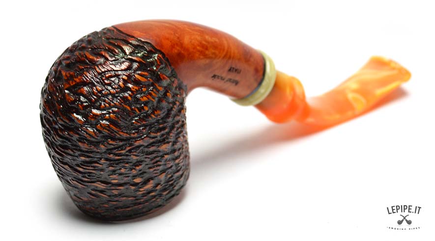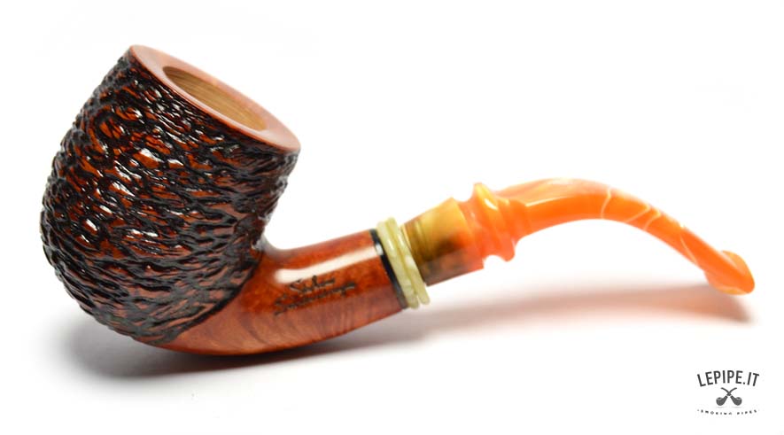 Handcrafted by Stefano Santambrogio, this Bent Billiard pipe features a rustic finish that gives the briar a unique and distinctive texture. The orange acrylic mouthpiece, paired with an elegant composite material band, complements the design, while the 9 mm filter mount allows for a customizable smoking experience.