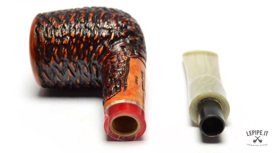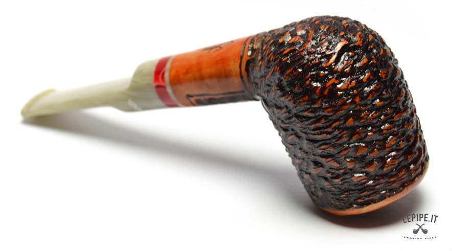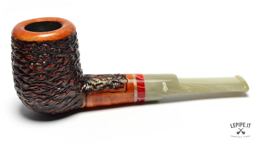 This pipe is handcrafted by Stefano Santambrogio and features a Billiard shape with a rustic finish that adds a unique texture to the briar. The light-colored metacrylate mouthpiece, paired with an elegant red band, gives the pipe a distinctive appearance. The 9 mm filter mount allows for a customizable smoking experience.