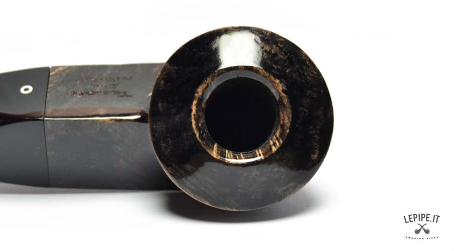 Bold and refined, this Talamona Rhodesian stands out with its dark smooth finish, accented by deep, glossy highlights. The sculpted design and contrast between polished surfaces and the natural tones of the briar give this pipe a striking presence—perfect for collectors or smokers looking for something truly distinctive.