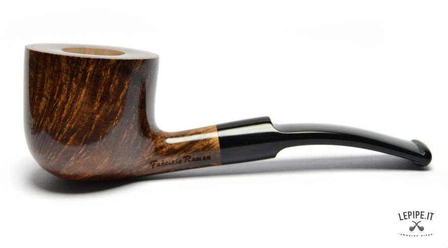 Compact, sturdy and full of charm, this bent pot by Fabrizio Romeo stands out for its slightly flattened base, allowing it to stand upright on its own. A feature that adds both function and character to an already well-balanced and inviting shape. The briar shows a consistent flame grain, enhanced by a glossy finish that brings out its warm, rich tones.