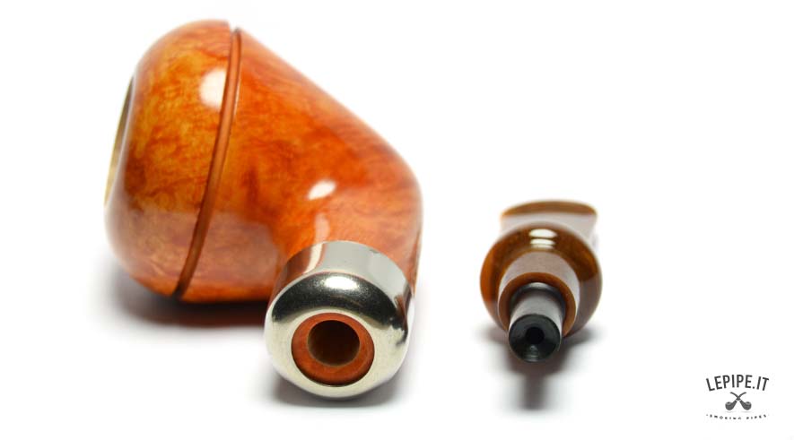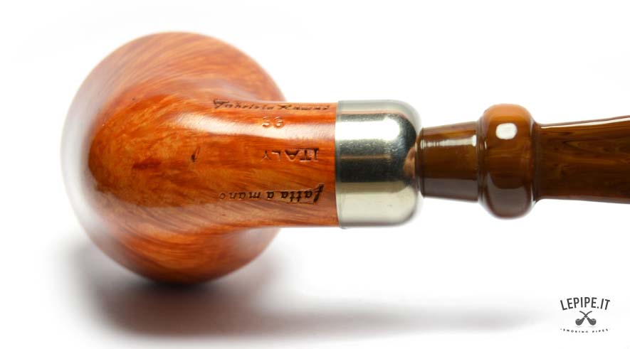 The transition between shank and stem is marked by a brushed metal band — discreet yet elegant — followed by an amber-colored acrylic stem with a bold, central bulge that acts as both visual accent and ergonomic grip. It’s a detail that reflects Fabrizio Romeo’s distinctive approach: thoughtful, measured, and always refined.
