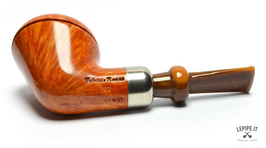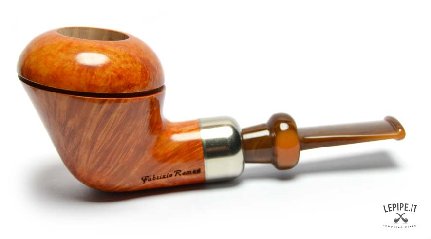 An exercise in style and formal precision, this handmade briar pipe in Dublin shape by Fabrizio Romeo immediately stands out for its striking play of volumes and the perfect balance between tradition and originality. The silhouette is compact yet sculptural, with a tall, flared bowl that gives vertical momentum, grounded by a strong, solid base.