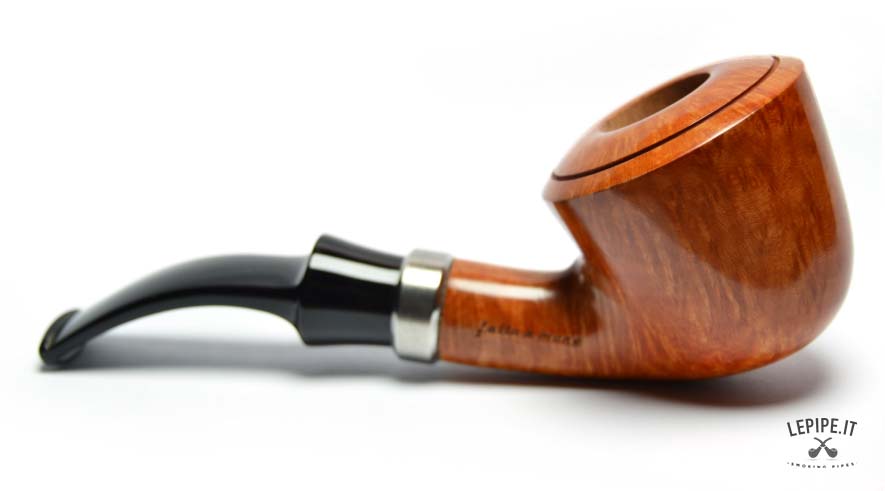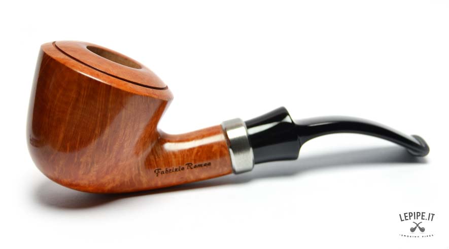 The shank and stem are joined by a brushed metal band, providing a smooth transition to the glossy black, gently bent stem. With a 20 mm internal diameter, the bowl is ideal for controlled, focused smokes. As always, Fabrizio Romeo demonstrates his technical skill and aesthetic finesse, crafting a pipe that expresses both restraint and elegance.