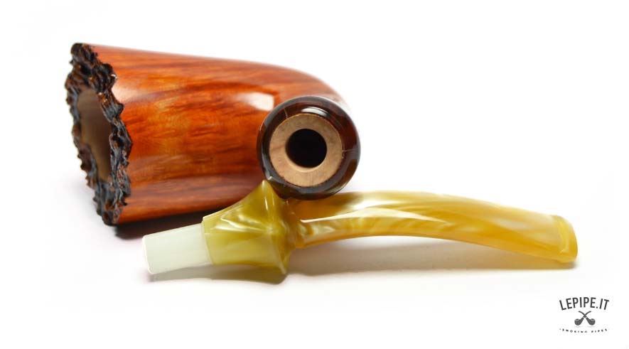 The briar, selected from top-grade stock and classified in the prestigious Group SG, features lively and regular vertical flame grain, enhanced by a warm, transparent finish in deep honey and caramel tones. The yellow pearl acrylic stem is a bold design statement: shaped, flared and carved with precision, it brings a touch of the unexpected while remaining perfectly balanced and practical.