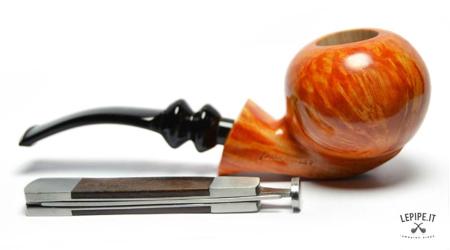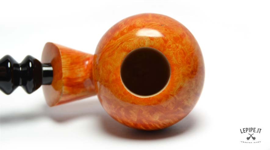 The briar, carefully selected and classified in Group SG, reveals tight, vivid flame grain dancing across the surface, brought to life by a warm, transparent finish. Light reflects differently on every curve, enhancing the visual rhythm of the full-bodied bowl. In contrast, the glossy black acrylic stem — sculpted with a double waist — adds a refined, almost baroque accent to the pipe’s overall silhouette.
