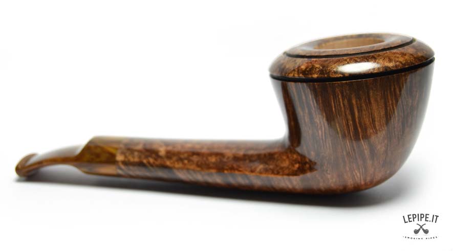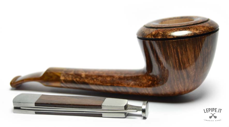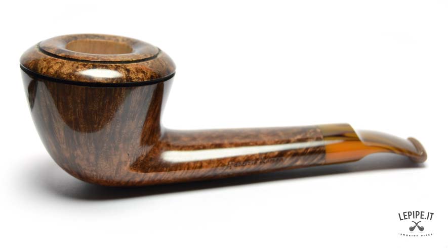 Compact, elegant, and meticulously refined, this Bent Dublin handmade briar pipe by Fabrizio Romeo stands out for its balanced proportions and the subtle graphic detail of its double-grooved rim. The silhouette is soft yet defined, with a gentle curve that guides the eye smoothly from the stem to the bowl.