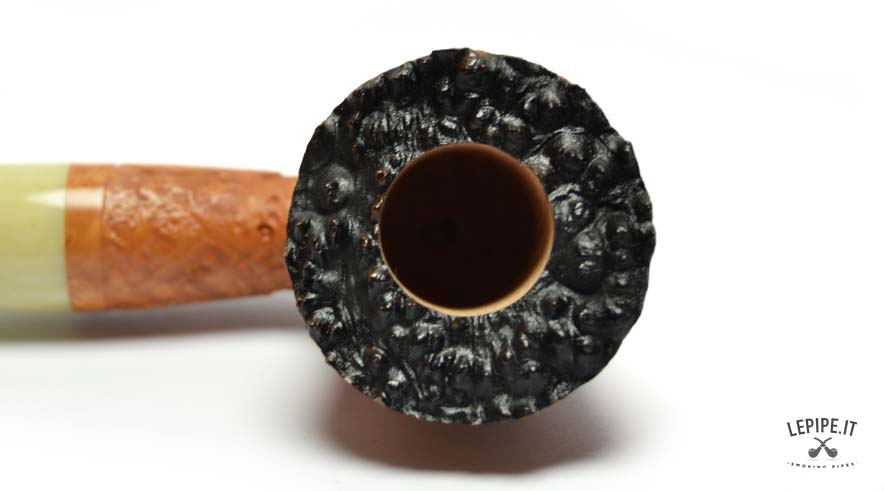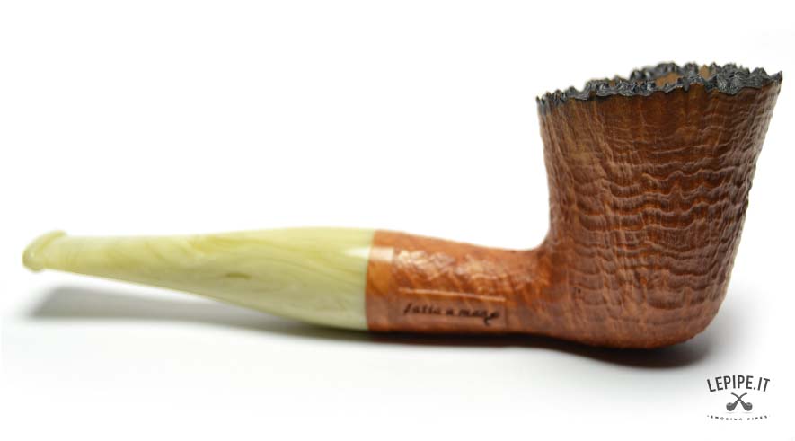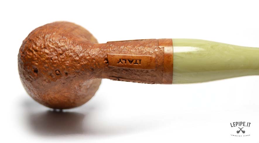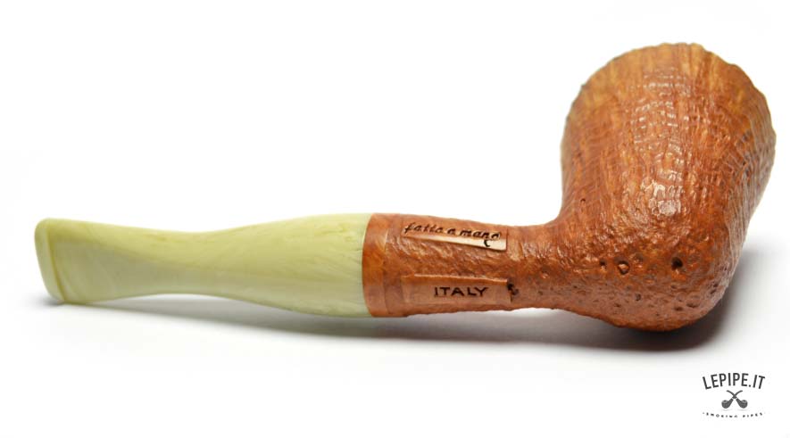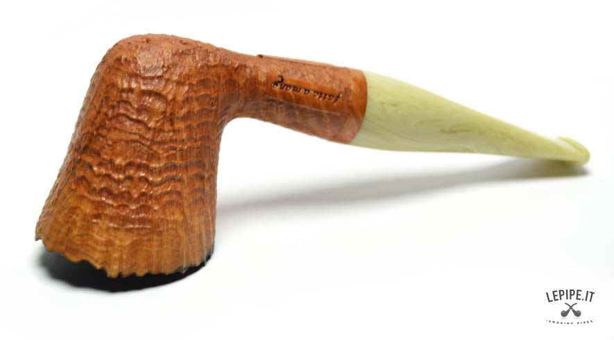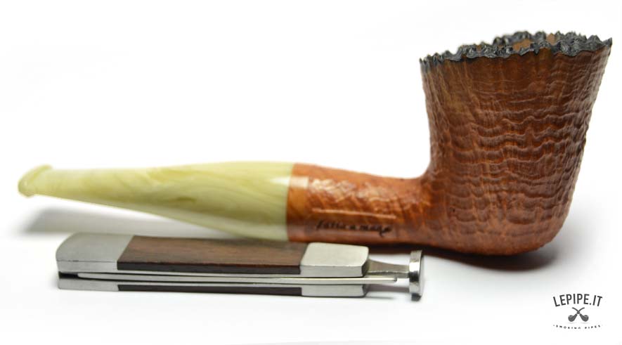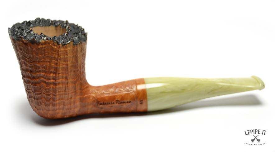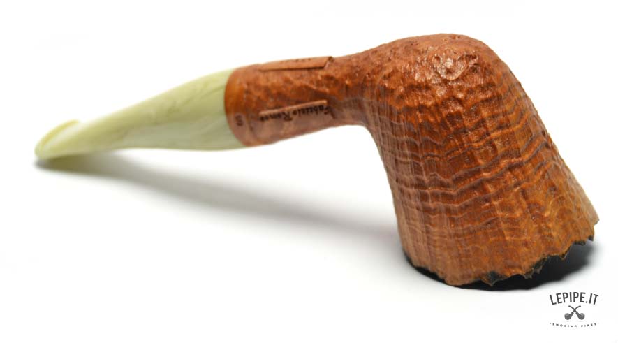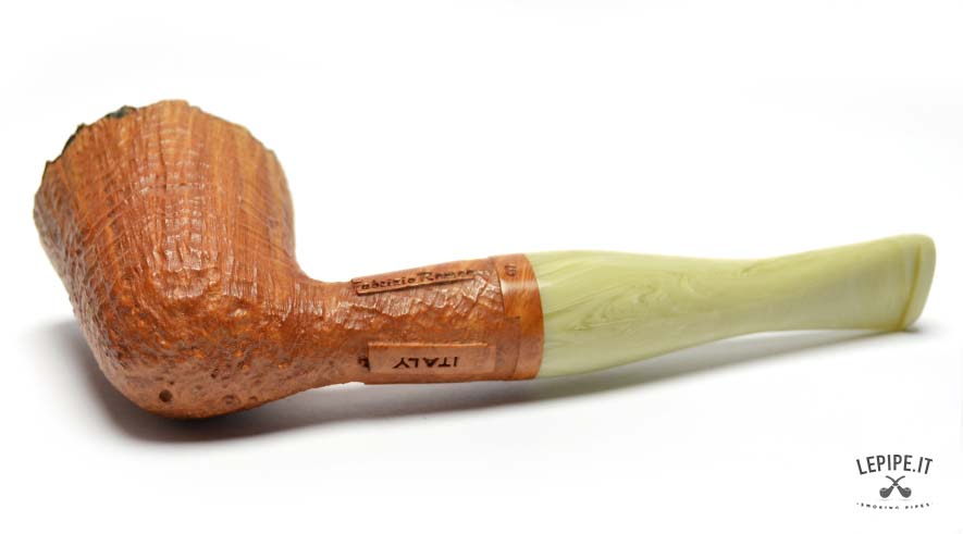 This sandblasted Dublin pipe by Fabrizio Romeo stands out for its clean, minimalist profile enhanced by a bold sandblasting that runs across the entire bowl, ending in a striking natural plateau rim. The slightly forward-leaning bowl adds a touch of movement to the otherwise traditional shape.