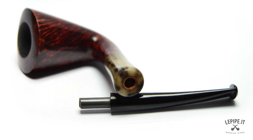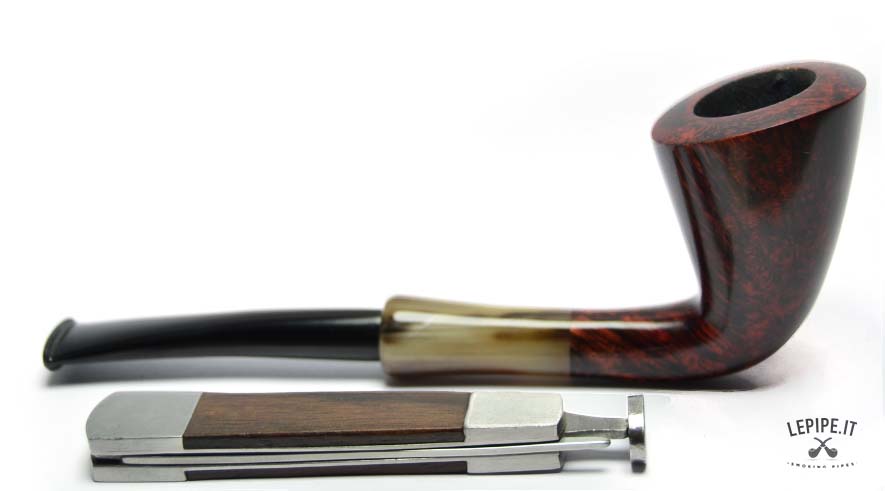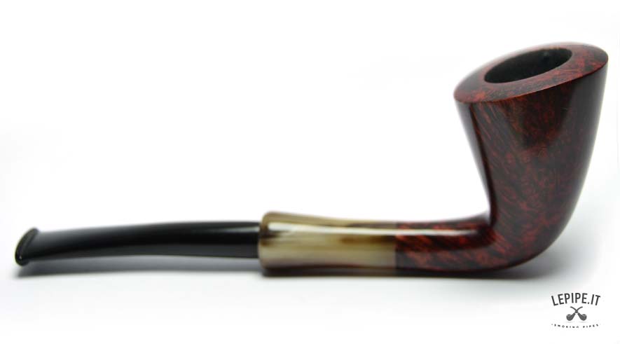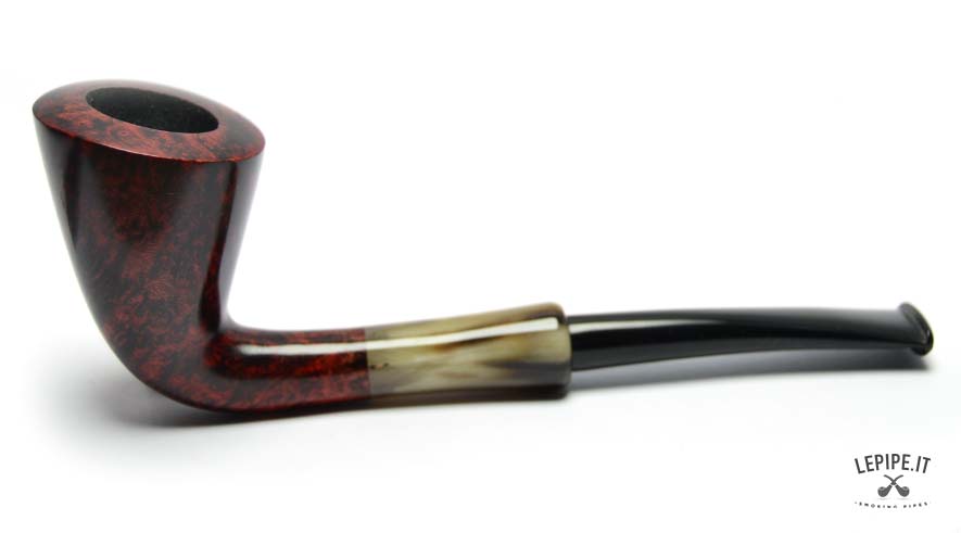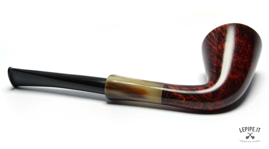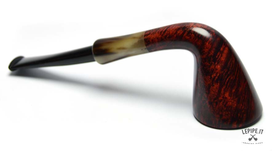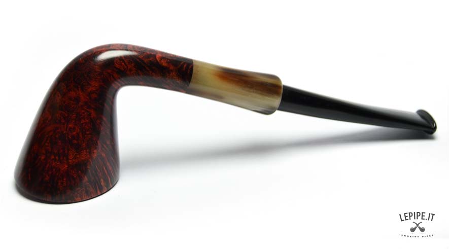 This Bent Dublin pipe is handmade by Bruno Nuttens and stands out for its graceful, flowing profile enhanced by deep red flame grain. The contrast with the horn-effect ebonite stem adds character while maintaining the refined balance of the shape.
