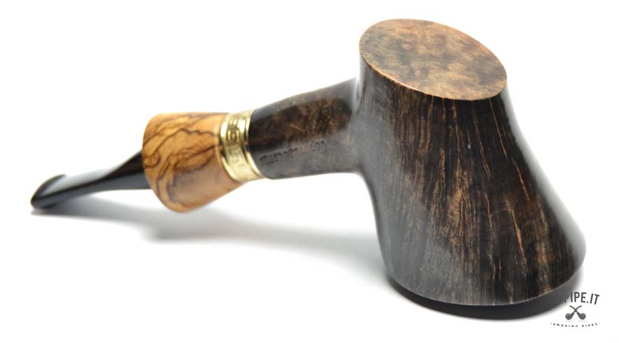 The dark, deep finish enhances the natural grain of the briar, offering a vibrant contrast to the light, flamed olivewood insert, framed by an elegant gold-colored metal ring. The methacrylate stem, glossy black with a white dot, completes the design with a modern edge, while providing excellent durability and comfort.