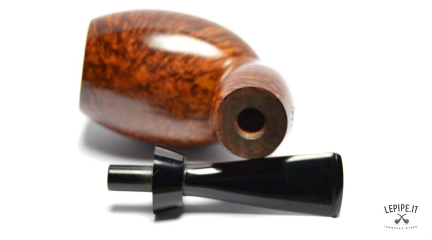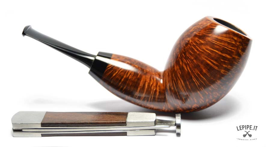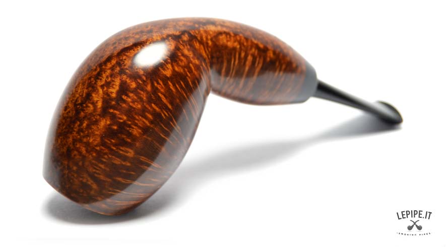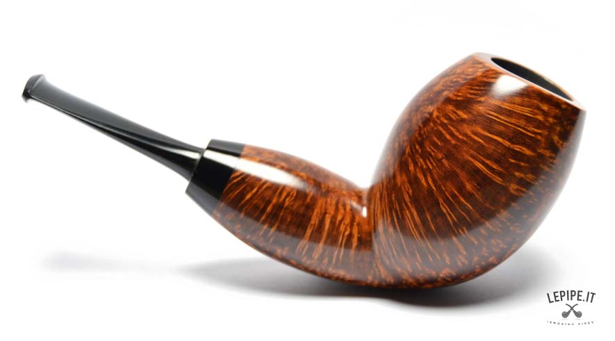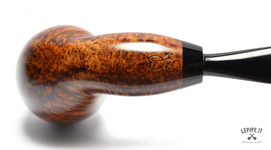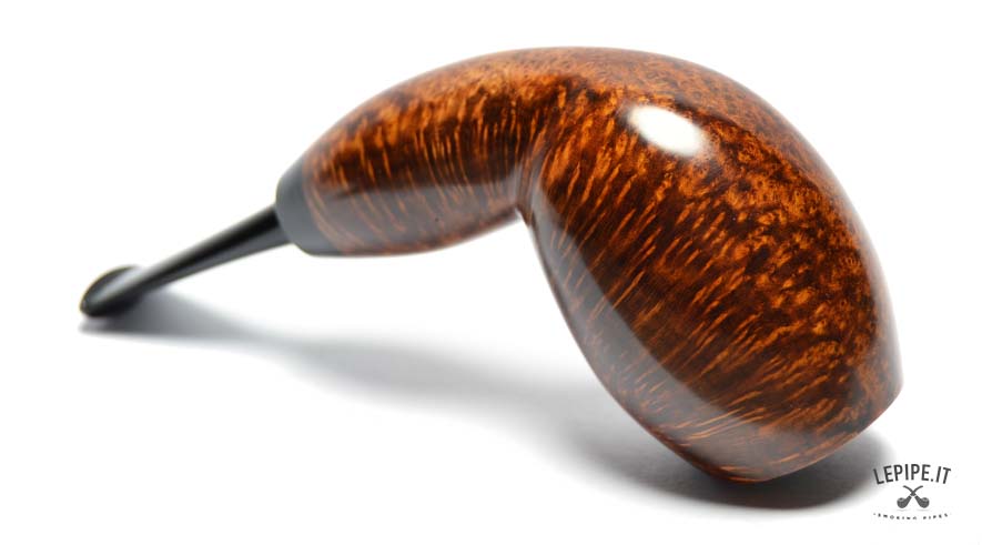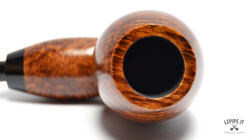 The radial flame grain, precisely executed, follows the pipe’s curves and radiates from the bottom outward like fine, delicate petals. A clear, glossy finish enhances the wood’s texture, turning the surface into a play of light and depth. The ebonite stem, straight and polished black, supports the body’s motion without interrupting its visual rhythm. With a weight of 45 grams, the pipe remains surprisingly lightweight and easy to handle despite its generous volume.