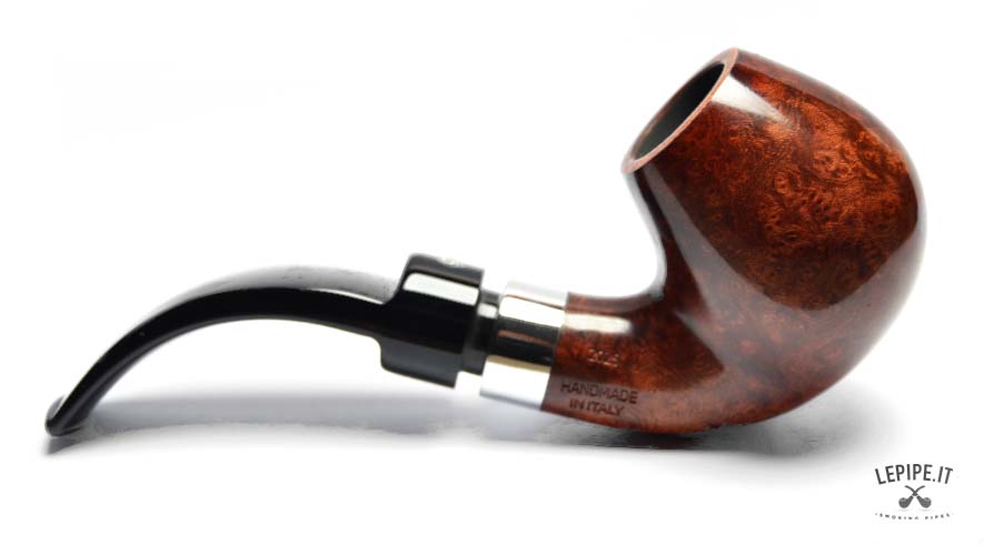 The briar is enhanced by a smooth finish that highlights the depth and movement of the natural grain, giving the pipe a warm and refined appearance. The shank connects to the stem through a polished metal band, an elegant detail that adds brightness to the overall design.