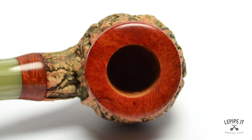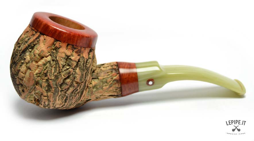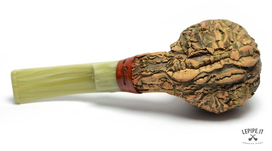 Realizzata in radica di alta qualità, questa pipa è rivestita con uno strato di autentico sughero sardo, una caratteristica esclusiva del marchio Spanu, unico produttore al mondo a utilizzare questa tecnica brevettata. La texture naturale del sughero crea un contrasto affascinante con il bordo liscio del fornello, rifinito in tonalità calde e brillanti.
