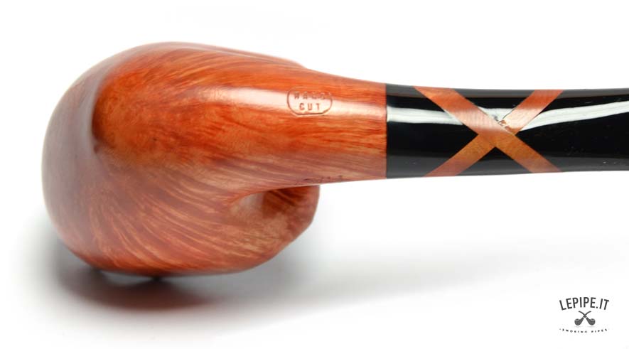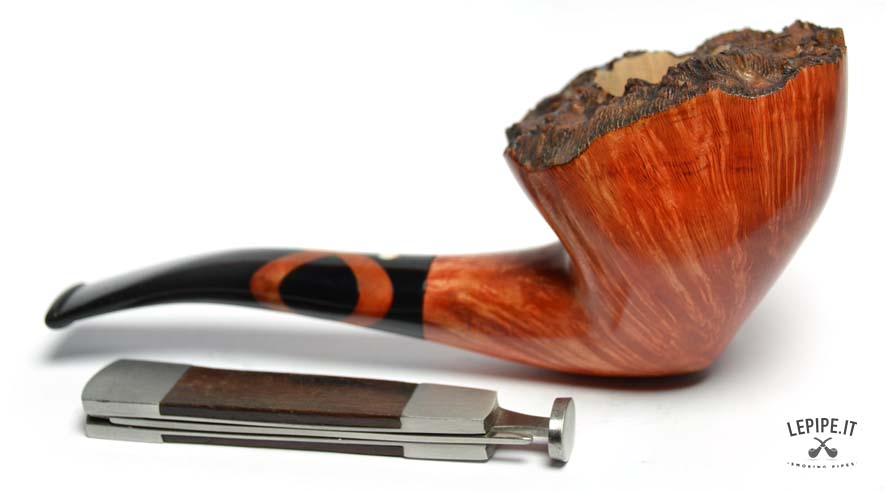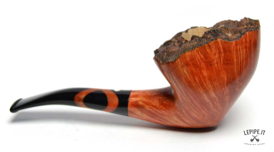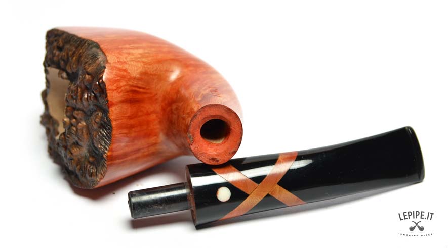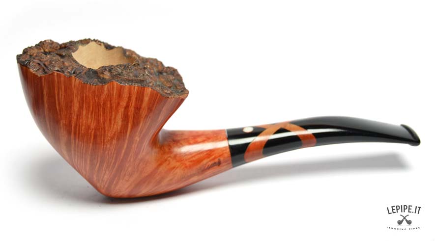 La radica chiara è impreziosita da una bellissima fiammatura verticale, che ne esalta la profondità visiva. Il bocchino in metacrilato nero è decorato da un intarsio circolare in legno, dettaglio distintivo che aggiunge eleganza e unicità al pezzo.
