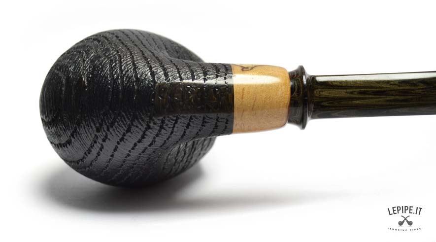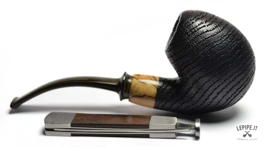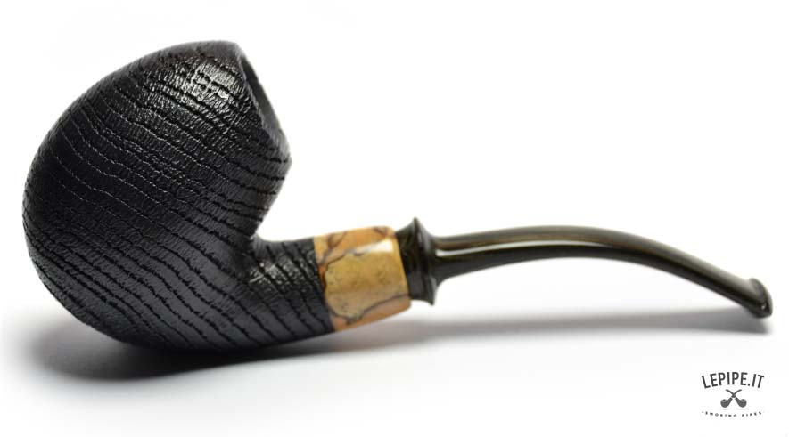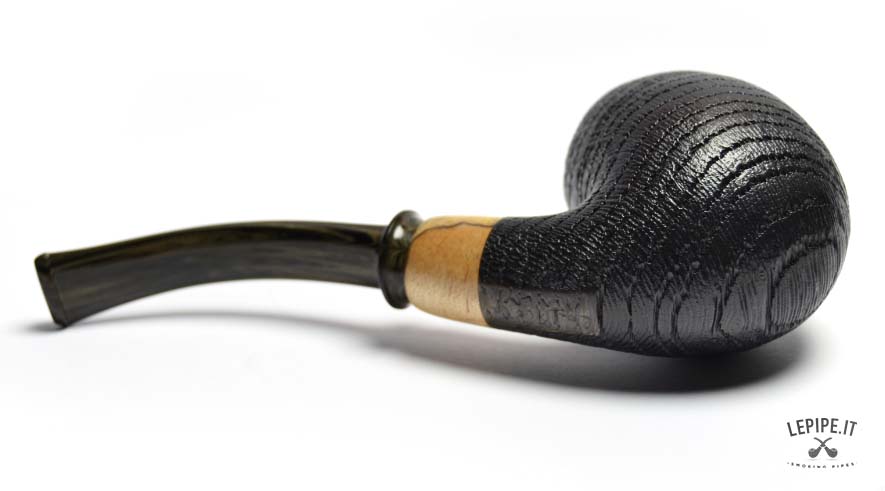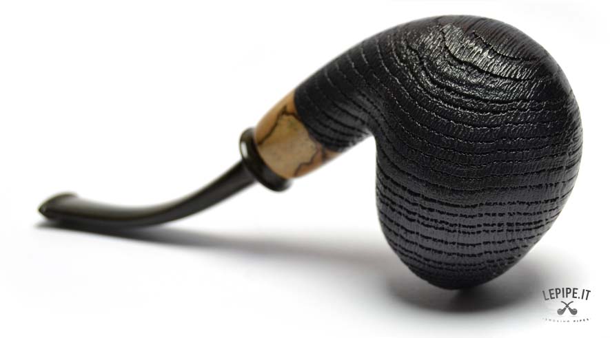 Una pipa che unisce fascino arcaico e raffinatezza contemporanea: questa creazione firmata La Biota è realizzata in autentico legno di morta, un materiale fossile di straordinario pregio, estratto da antichi giacimenti sommersi e lavorato con cura maniacale. La forma Bent Egg, morbida e avvolgente, accoglie il palmo con naturalezza, mentre la superficie finemente sabbiata valorizza le onde scure e compatte del legno, creando un pattern unico e profondamente materico. Il raccordo in legno chiaro, venato e satinato, introduce un contrasto cromatico ricercato, che accompagna con armonia il bocchino curvo in tonalità bruna. Ogni dettaglio esprime l’equilibrio perfetto tra potenza organica e controllo formale, in una pipa che racconta una storia lunga secoli e un’estetica profondamente contemporanea.