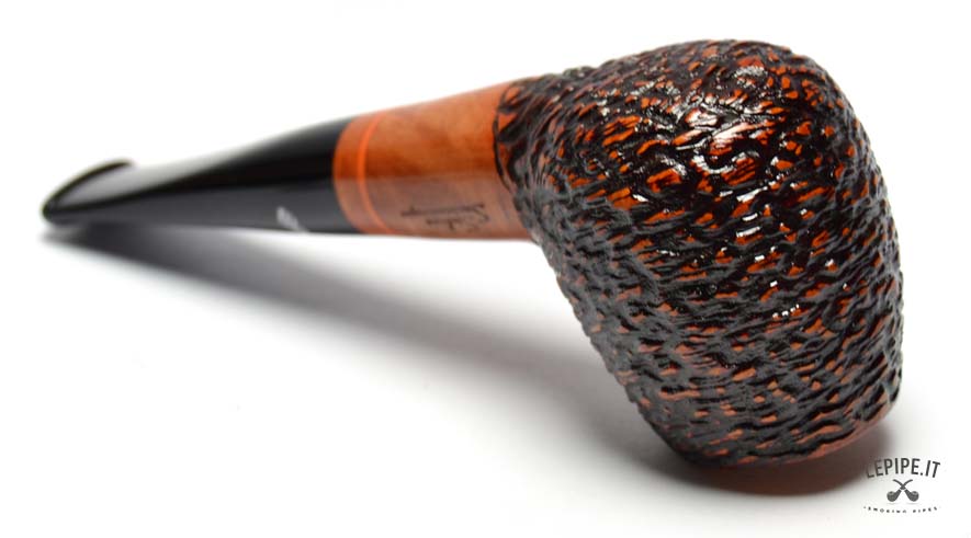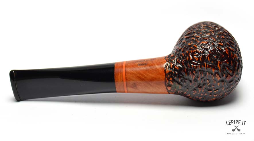 The Billiard shape of this pipe, handcrafted by Stefano Santambrogio, is complemented by a rustic finish that gives the briar a unique texture. The black metacrylate mouthpiece and composite material band add an elegant touch, while the pipe is filterless for a more natural and direct smoking experience.