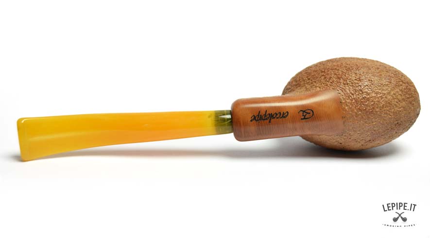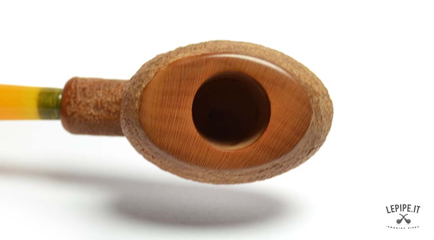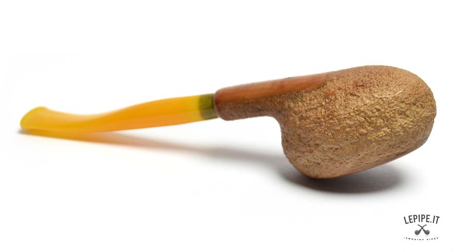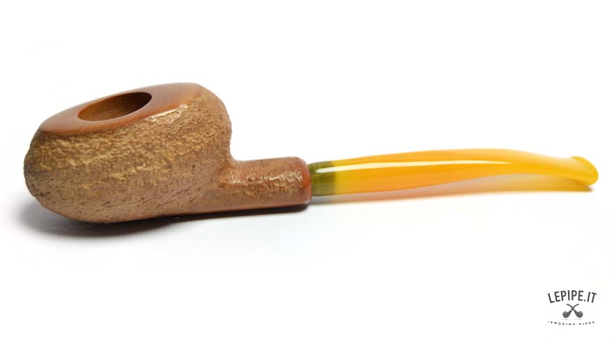 This handcrafted pipe by Bogni immediately draws attention with its minimalist yet striking design. The Freeform shape, carefully crafted to stand on its own, balances functionality and style, making it ideal both for daily use and as a display piece. The fine, uniform rusticated finish offers a pleasant texture and a natural look, subtly highlighting the warm tones of the briar. The acrylic stem, in translucent amber hues with green accents, adds a bright, modern touch that contrasts elegantly with the bowl. A creation with a free and practical spirit, perfect for those who enjoy standing out with subtlety and value every detail of fine Italian craftsmanship.