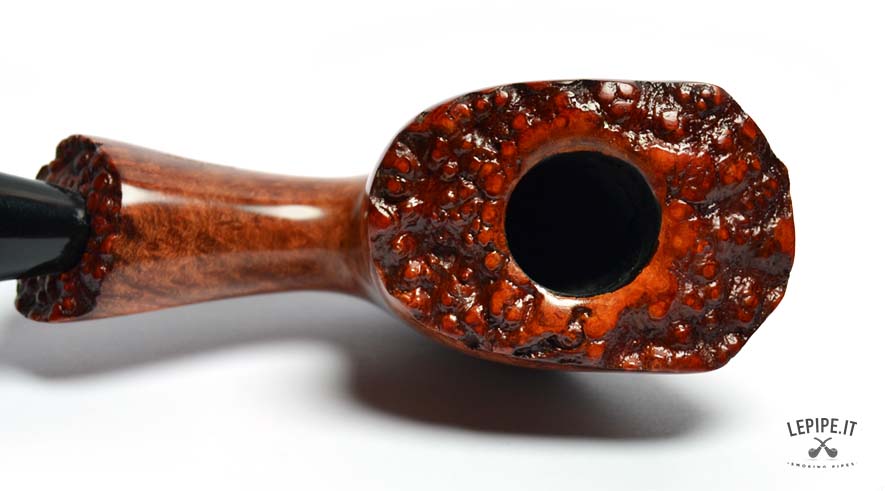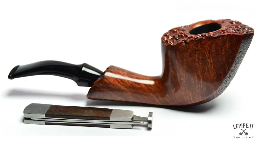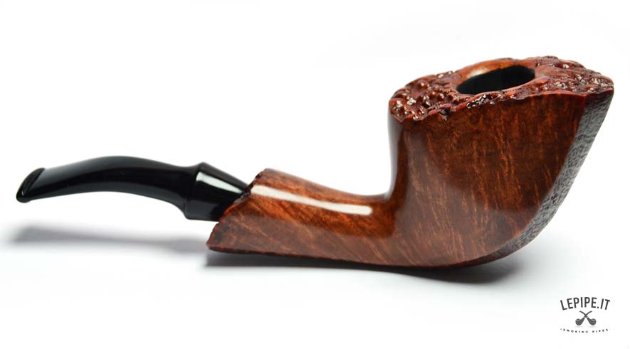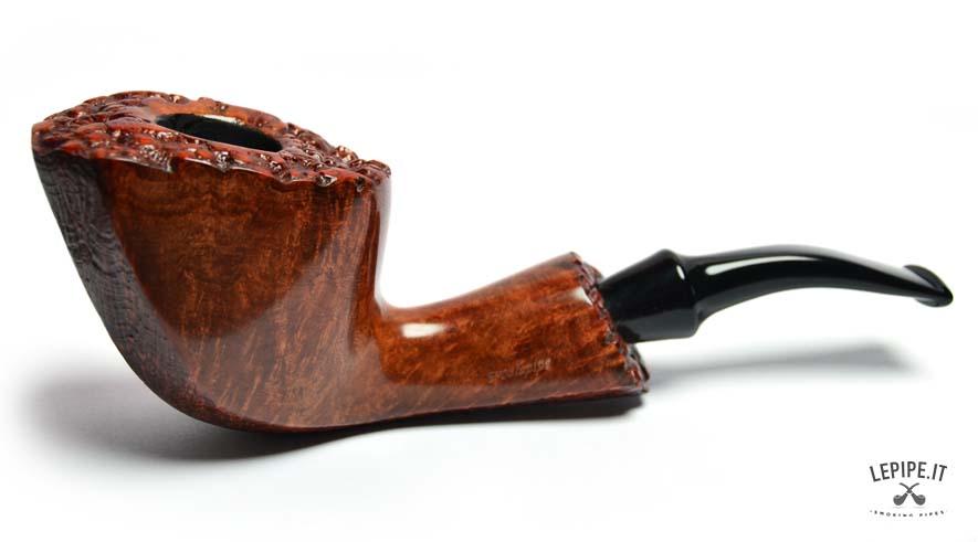 This Bogni pipe combines the bold expressiveness of the Panel shape with the practicality of a Stand-Up base, offering a sculptural yet functional presence. The craftsmanship alternates between smooth, polished surfaces that highlight the briar’s natural grain and rusticated sections that add texture and visual contrast. The sharp, well-defined lines typical of the Panel style give the piece a strong personality, while the slightly curved black stem completes the design with understated elegance. A pipe that reflects Bogni’s artisanal mastery, perfect for those who appreciate bold shapes and tactile refinement in a piece that is as practical as it is distinctive.