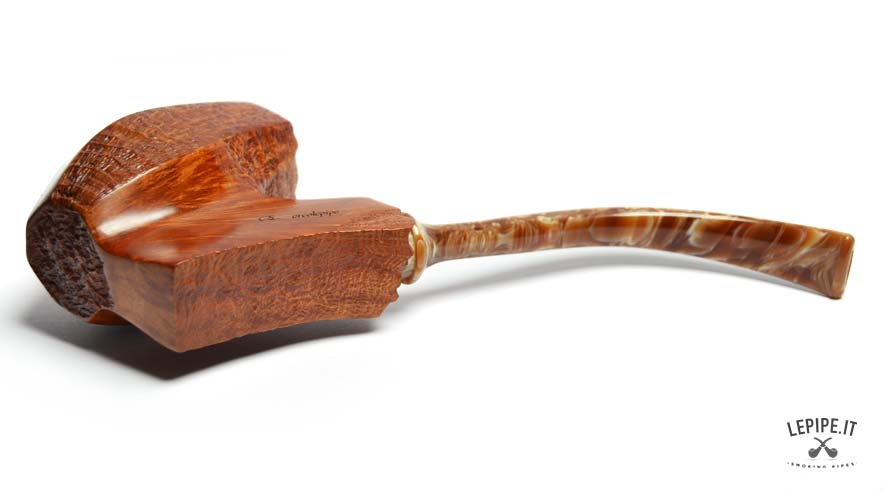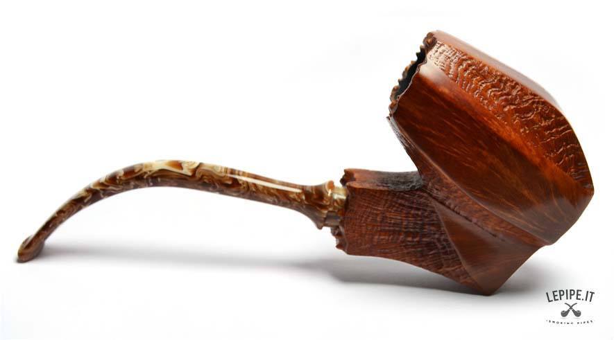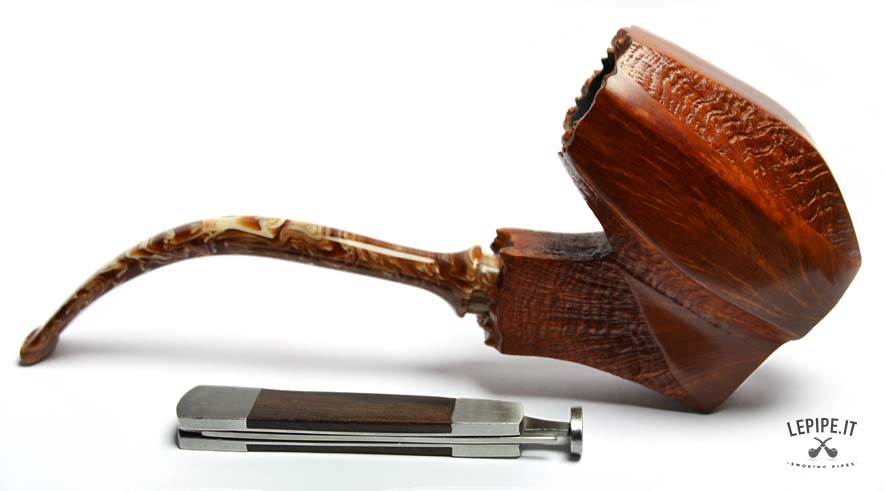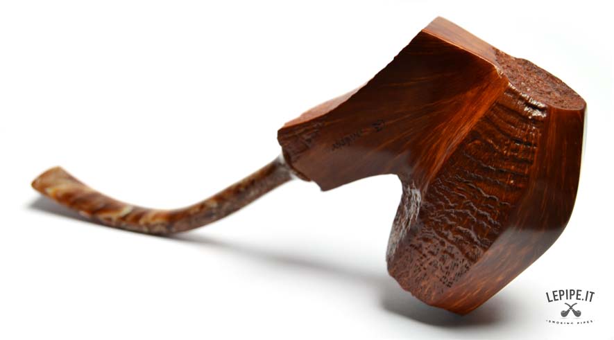 Bold and striking, this Stand-Up Panel pipe by Ercole Bogni is a true handheld sculpture. The geometric, angular design unfolds through sharp edges and flat surfaces, interrupted by rusticated sections that add depth and character to the briar. The top of the bowl preserves the natural plateau, creating a tactile and visual contrast with the smooth, polished side panels. The acrylic stem, with its warm tones and swirling patterns, complements the shape with elegance and uniqueness. Its arched profile and flat base allow it to stand upright on its own, adding functionality to a piece that already stands out for its style and personality. A pipe for true connoisseurs, blending art and everyday usability.