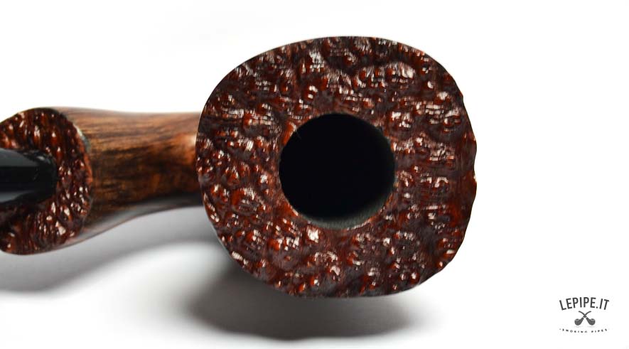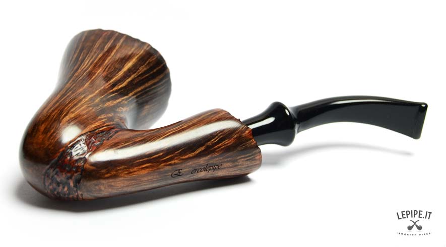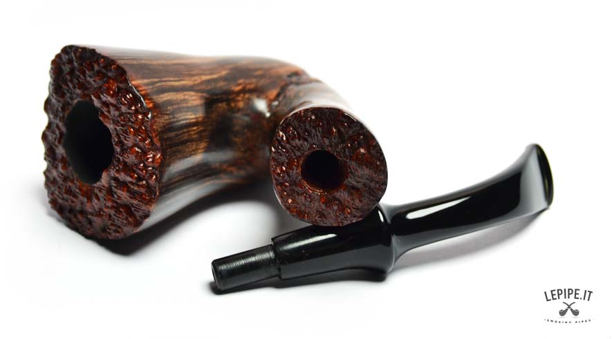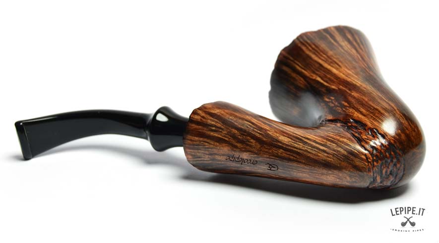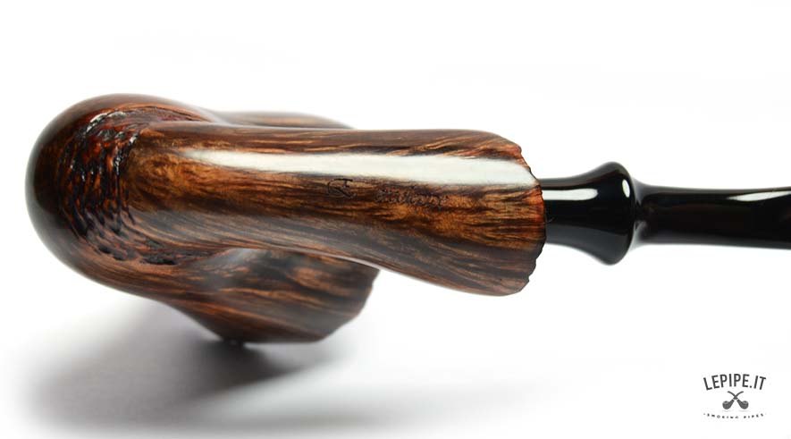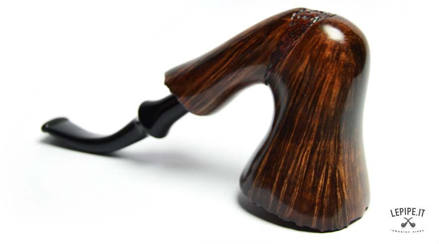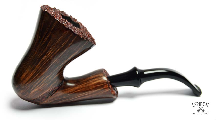This impressive Freeform pipe by Ercole Bogni is a sculptural piece designed to highlight the natural beauty of the briar. Standing 70 mm tall and weighing 68 grams, it has a strong presence while remaining well-balanced in hand. The bowl rises in bold curves to a wide rim that retains the original plateau, creating a striking contrast with the smooth, polished surfaces that reveal deep and consistent flame grain. The flowing lines transition harmoniously into the curved black methacrylate stem, completing a dynamic and cohesive design. Without a filter, this pipe offers a direct and authentic smoking experience—perfect for those who appreciate craftsmanship, natural materials, and unconventional shapes.