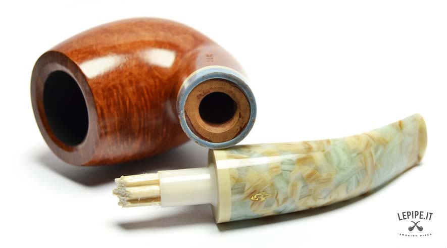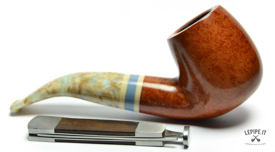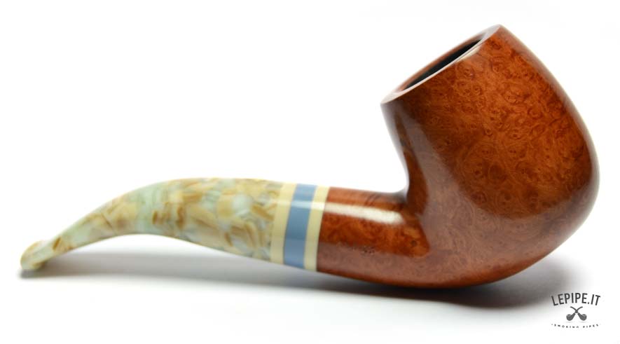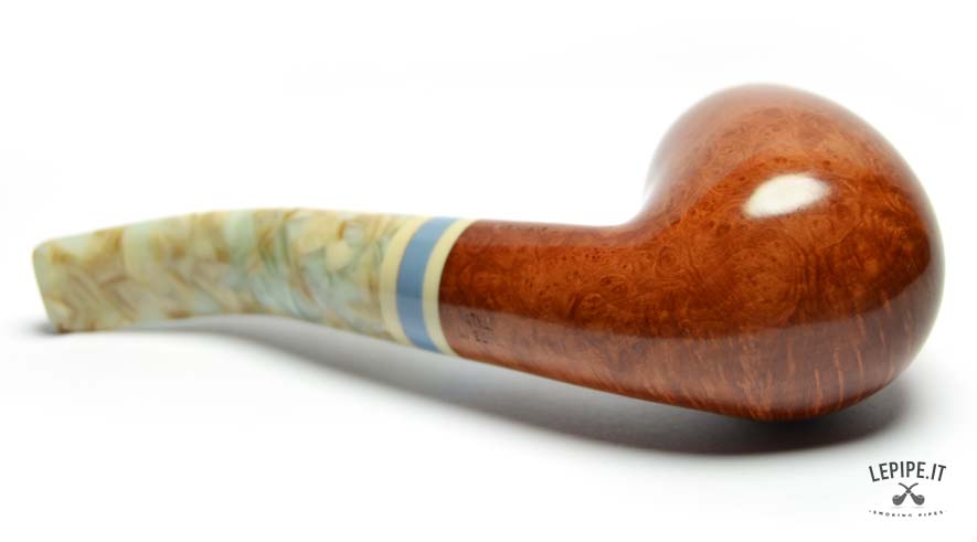 The smooth briar reveals stunning birdseye and burl grain patterns, brought to life by a polished surface that adds warmth and radiance. The marbled acrylic stem, with its soft, flowing shades, pairs harmoniously with the distinctive triple band in ivory, blue, and beige that defines the series.
