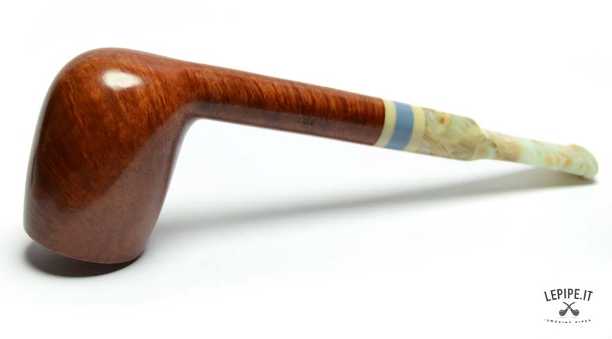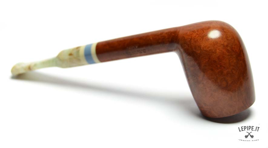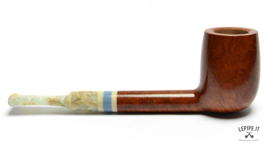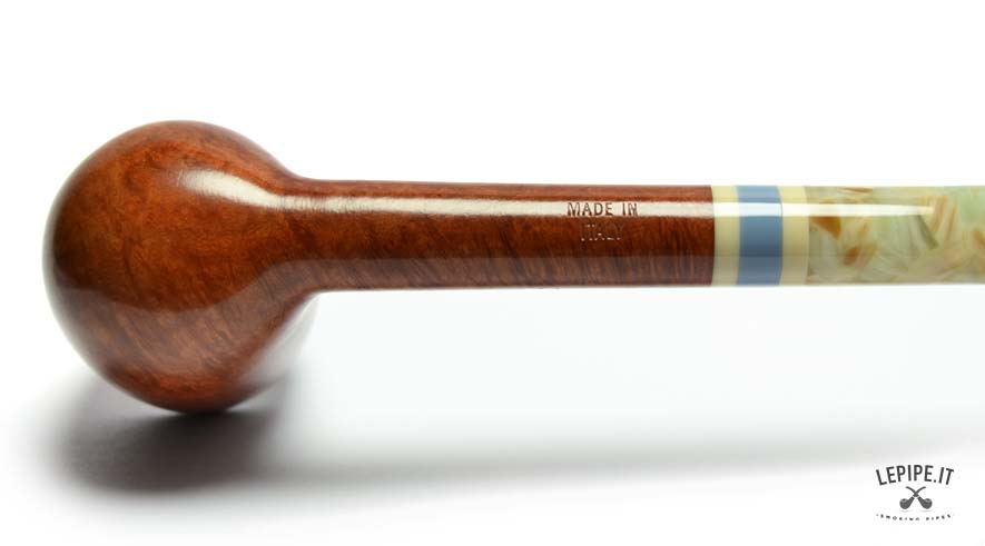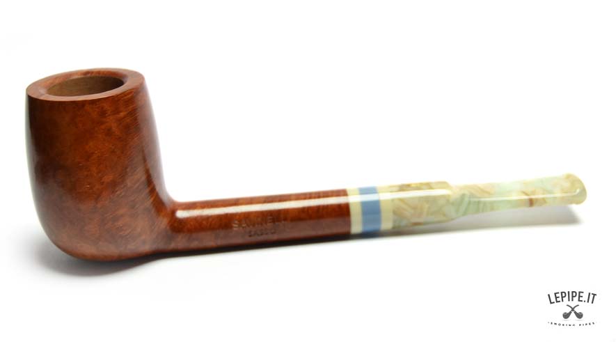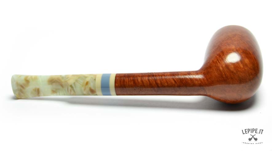 The smooth finish reveals the quality of the briar with warm, consistent grain patterns, enhanced by a transparent polish that brings depth and brightness to the surface. The marbled acrylic stem adds a distinctive touch with its soft swirls, elegantly accented by the signature ivory, blue, and beige triple band of the Sasso line.