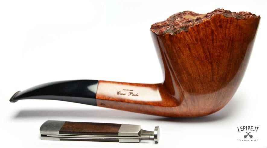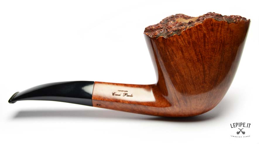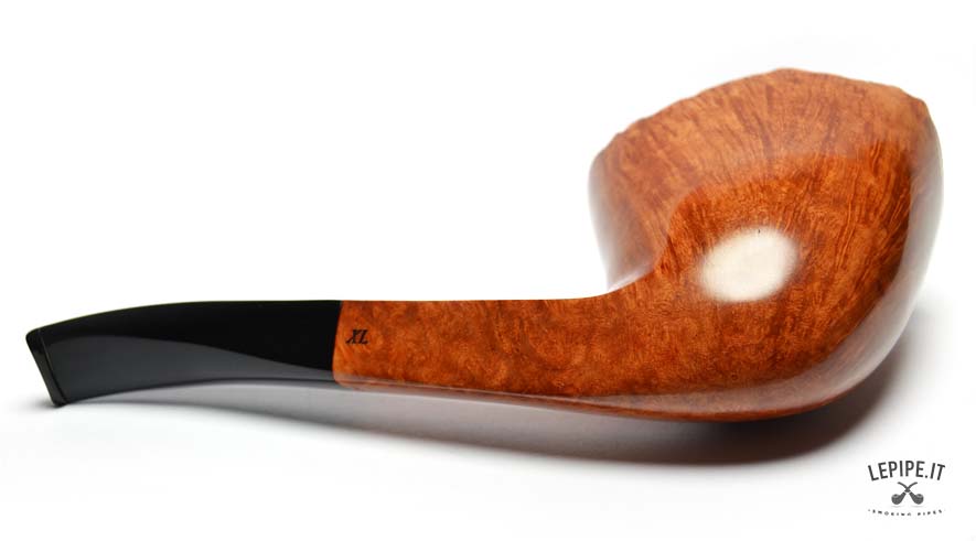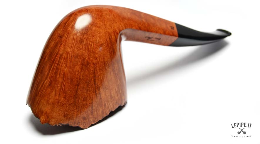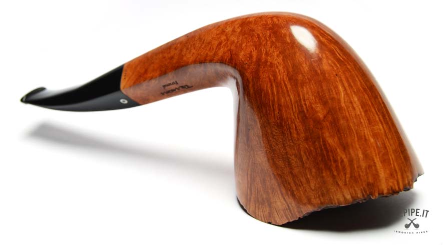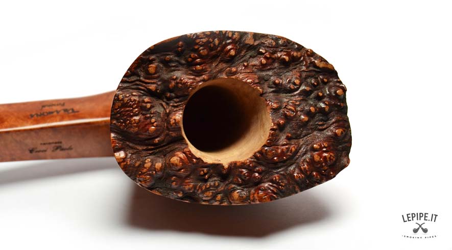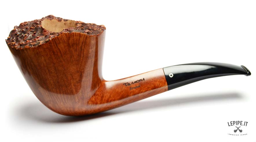 This Talamona pipe from the "Personal" line is a true expression of free and creative craftsmanship. The freeform shape, carved in harmony with the natural contours of the briar block, results in an elegant and flowing profile that culminates in a striking plateau rim left in its raw, organic state. The contrast between the smooth, mirror-polished surface and the rugged natural top creates a visually captivating effect that highlights the beauty of the raw material. The generously sized bowl, with an internal diameter of 23 mm and a depth of 60 mm, is designed for long, contemplative smokes, while the 53 mm outer diameter lends it a solid presence in the hand. With no filter, the draw is full and direct—perfect for the smoker who seeks a pure, unfiltered experience. The slightly curved black acrylic stem completes the piece with elegance and ergonomic comfort. A unique creation for those who value sculptural character and superior craftsmanship in every detail.