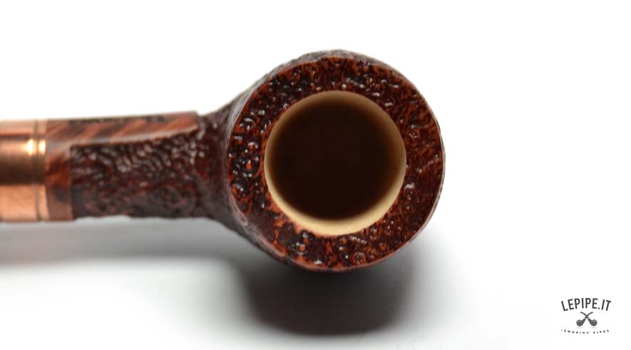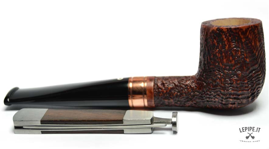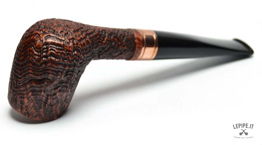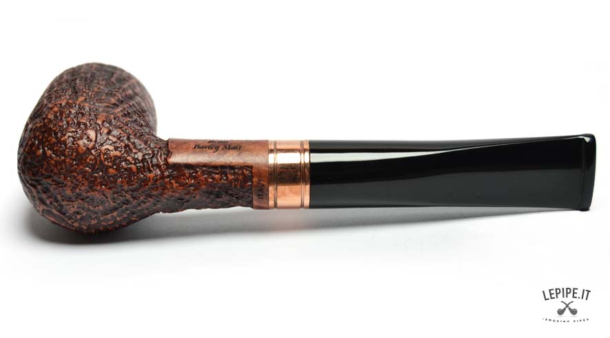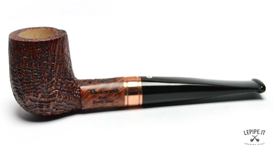 This Talamona pipe from the Barley Malt series offers a solid, well-balanced take on the classic straight Billiard shape, enhanced by artisanal details and a distinctive finish. The sandblasted briar, treated with a deep malt-red stain, reveals a striking pattern of concentric grain that adds both depth and visual texture. A refined copper ring adorns the junction between the shank and the black acrylic stem, serving as a signature element of the series. The flat black acrylic mouthpiece features a 9 mm filter slot, ideal for smokers who prefer a cooler and smoother draw. The overall design is harmonious and practical, making it perfect for everyday use as well as more contemplative moments of enjoyment. A pipe that combines sturdiness, elegance, and the quality of fine Italian craftsmanship.