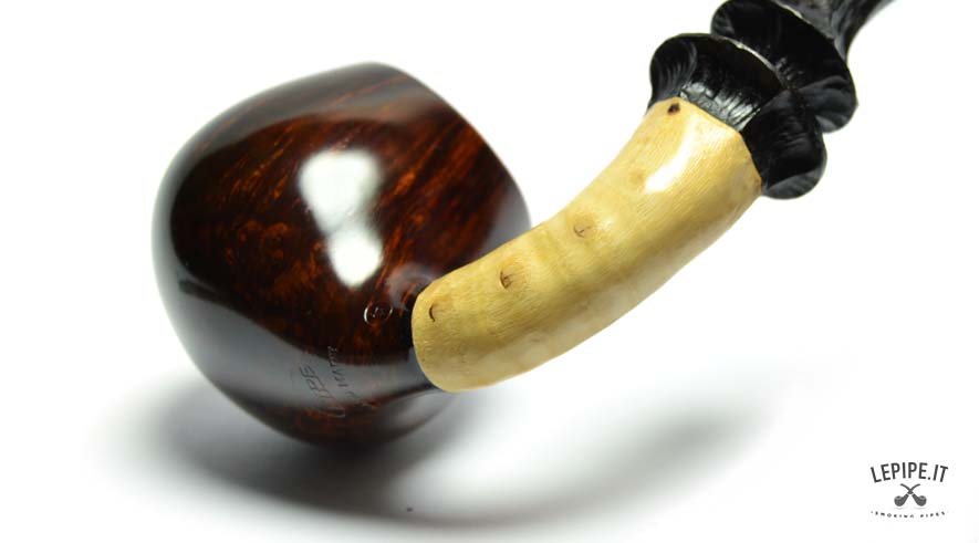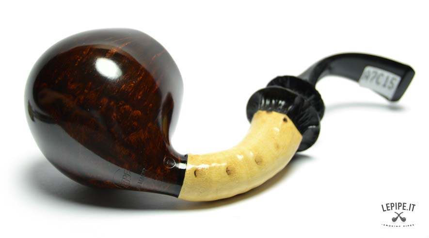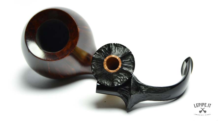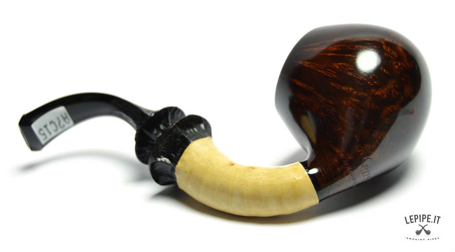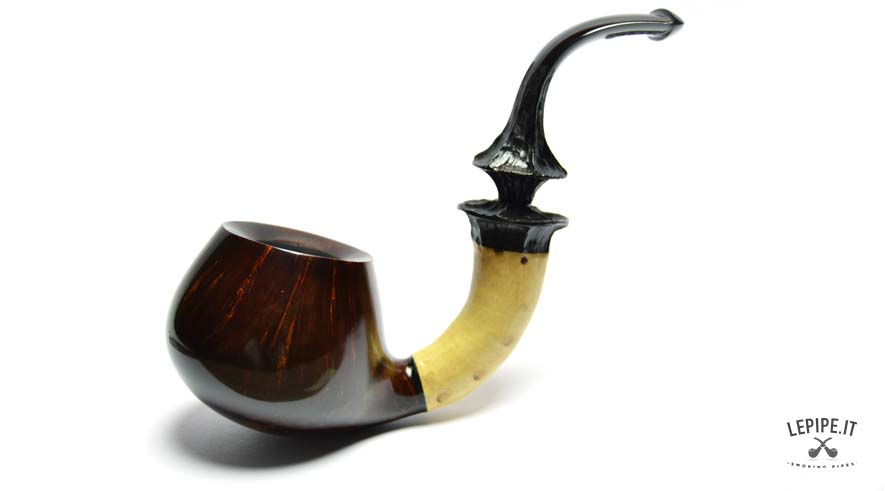 With this bold and imaginative creation, C-PIPE pushes the boundaries of pipe making, affirming its vision of the pipe as a true work of art. This Freeform model, part of Group 5, is a striking blend of exotic elegance and sculptural boldness. The bowl, meticulously polished to a mirror-like finish, reveals the full depth and vibrancy of the flame grain briar, with luminous streaks flowing across its smooth, compact surface. The shank, crafted from natural bamboo, adds organic warmth to the composition, enhancing the flow between curves and materials. Completing the structure is a hand-carved black methacrylate stem featuring a dramatic, gothic-inspired motif that rises in a theatrical twist, almost architectural in spirit. Every element of this pipe speaks of style, control, and creative freedom: nothing is accidental, yet everything surprises. It’s a pipe that breaks conventions and invites admiration as much as it does smoking. Every detail and material choice reflects Wilson Wang’s artistic maturity and his ability to transform a simple act into a visual and sensory ritual. Perfect for collectors and enthusiasts who seek the rare, the refined, the one-of-a-kind.
