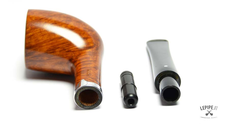 The straight black acrylic stem is designed for use with 9 mm filters and is joined to the shank by a polished metal band that reinforces the structure while maintaining a clean, continuous line. The overall design strikes a balance between classic elegance and modern refinement.