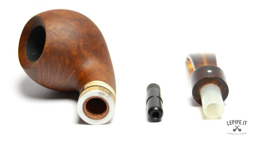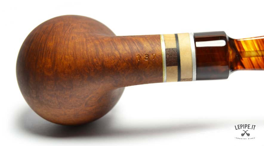 The amber-colored acrylic stem, with its pronounced bend, matches the bowl perfectly and is complemented by a signature multi-material band made of light wood, metal, and resin—an unmistakable hallmark of the series.