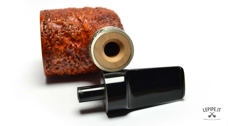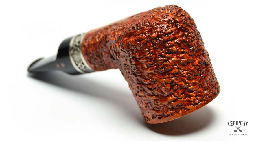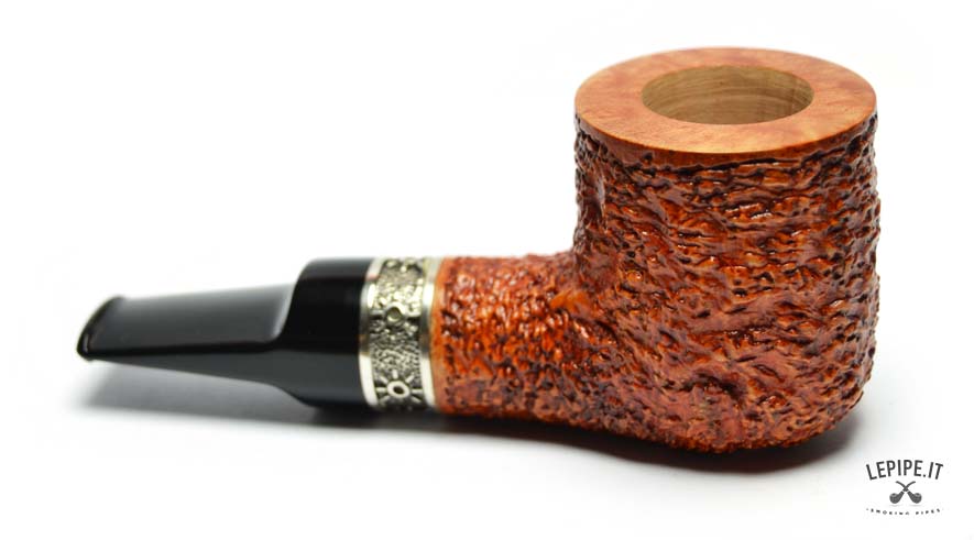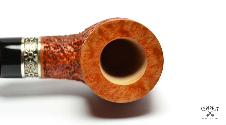 A compact yet bold pipe by Radice, masterfully blending craftsmanship and functionality. The deeply rusticated surface adds a rich, tactile quality to the briar, while the warm, glowing finish highlights every detail of the texture.